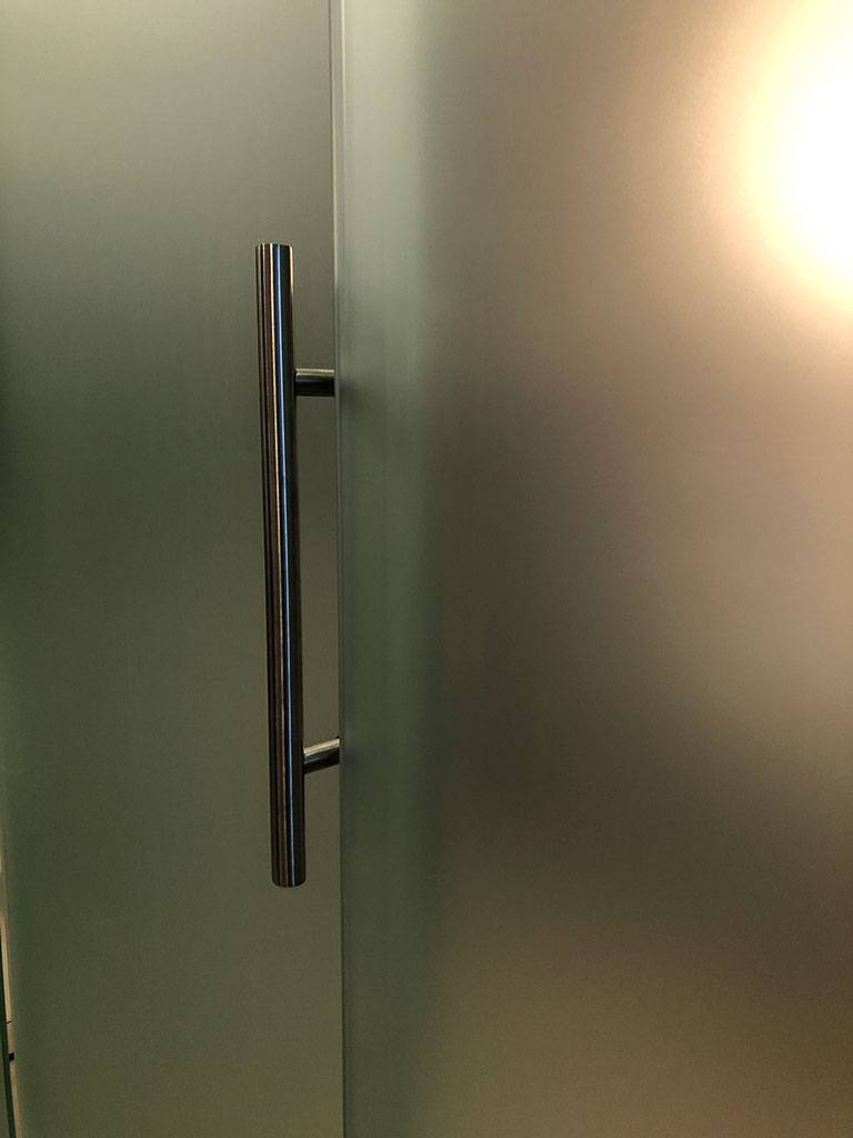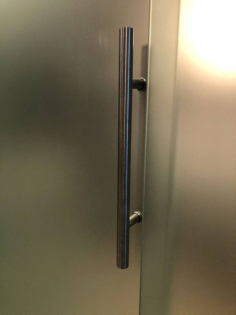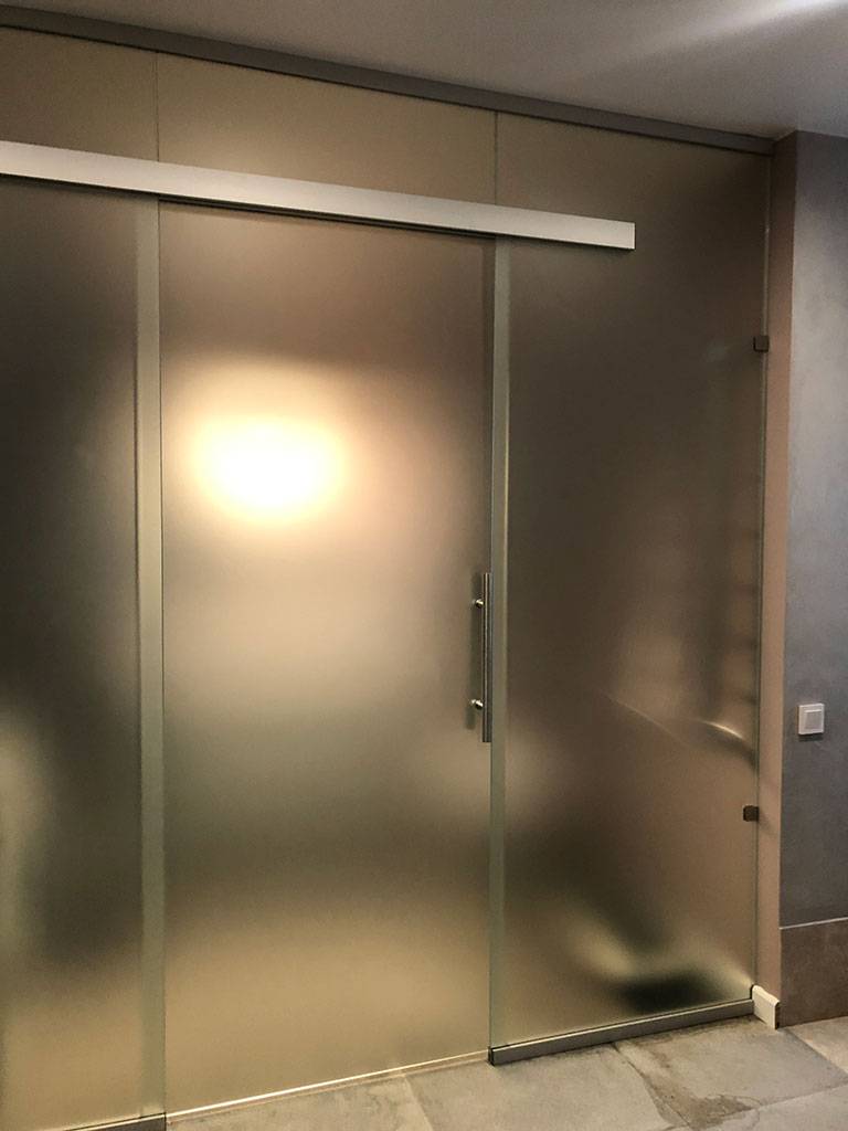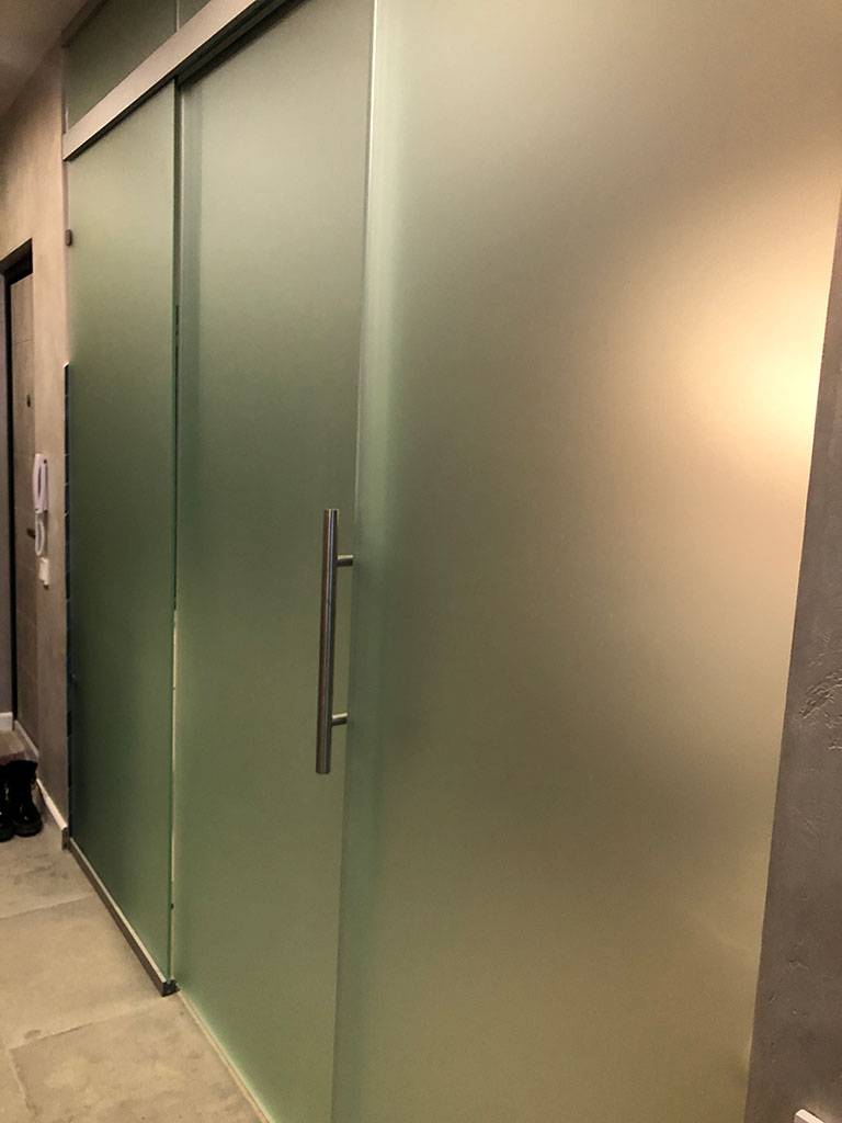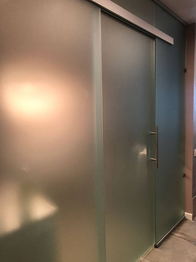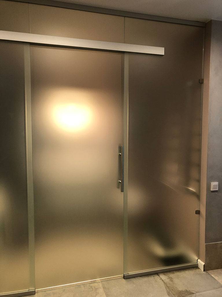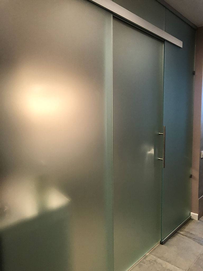 Для проекта мы выбрали 10-миллиметровое закаленное стекло и оклеили его матовой пленкой. В тон подобрали фурнитуру — под цвет анодированного алюминия. Предусмотрели доводчик, который не даст створке вылететь за пределы направляющей или удариться о боковую стеклянную панель. Таким способом абсолютно обезопасили стеклянную раздвижную дверь от любых повреждений.