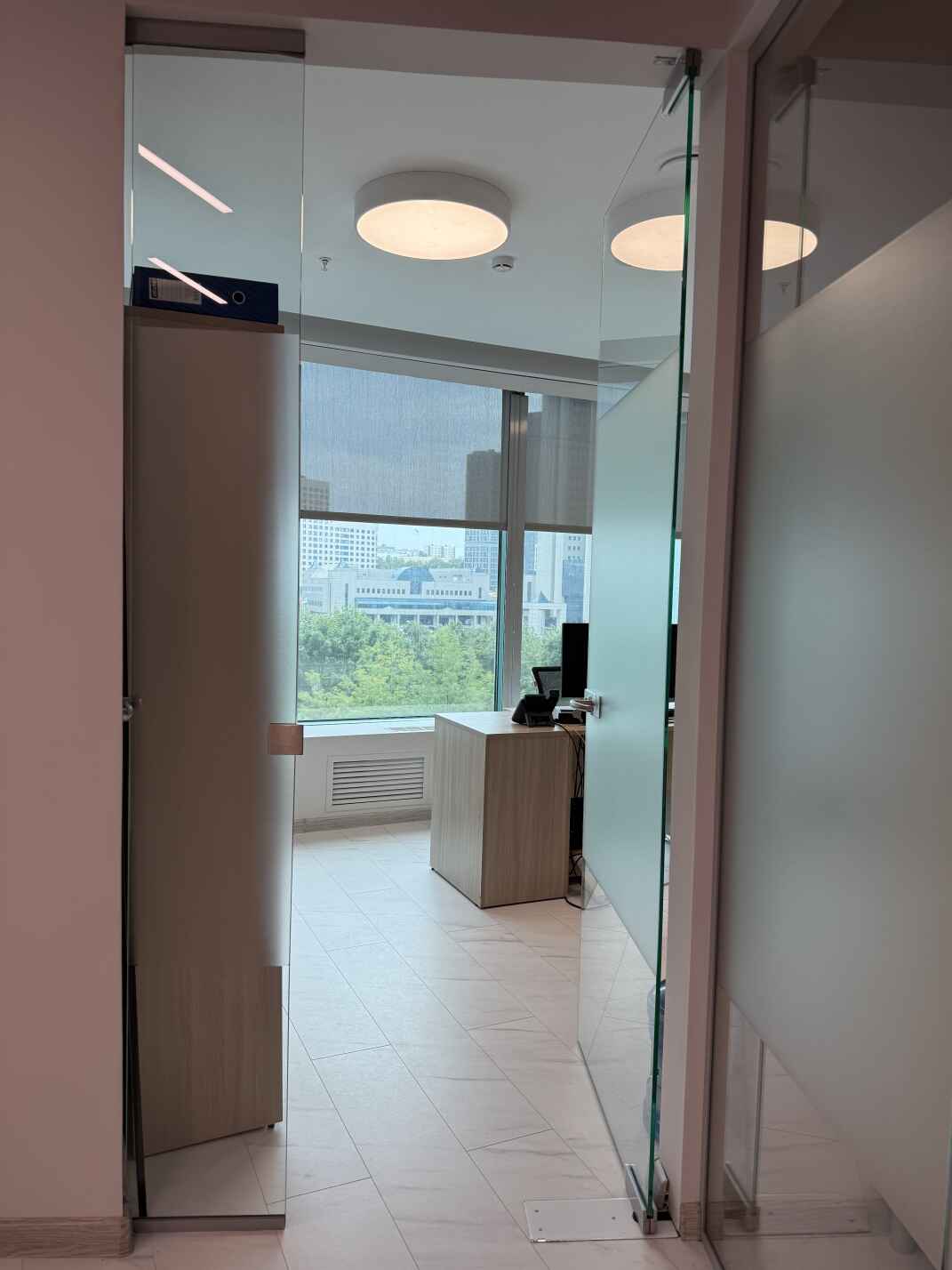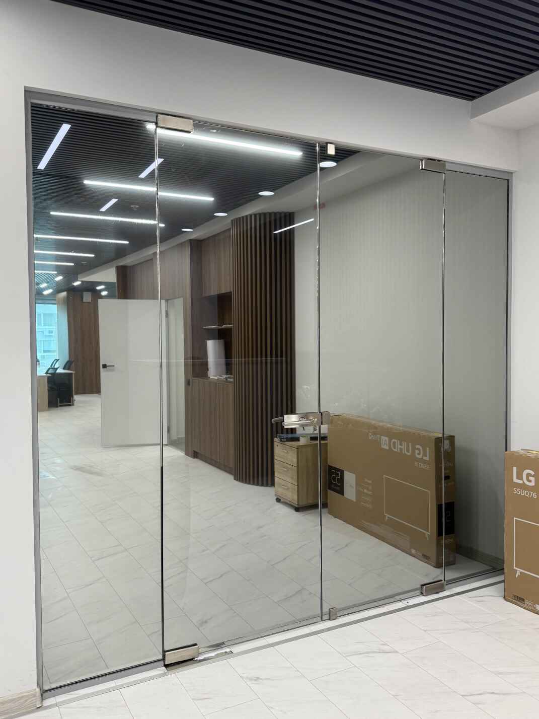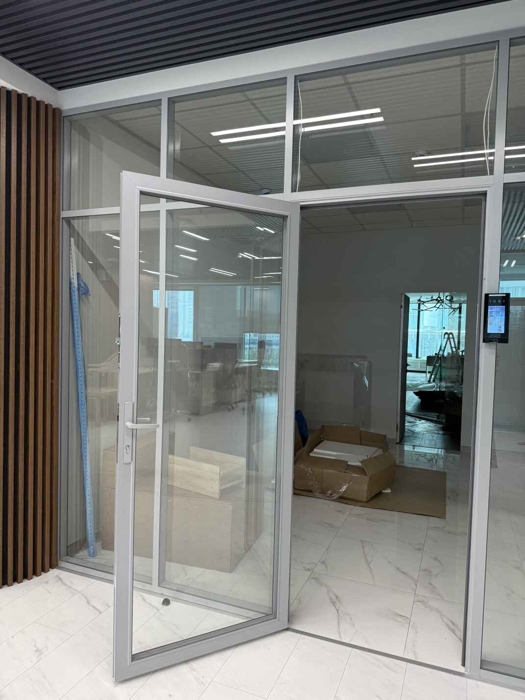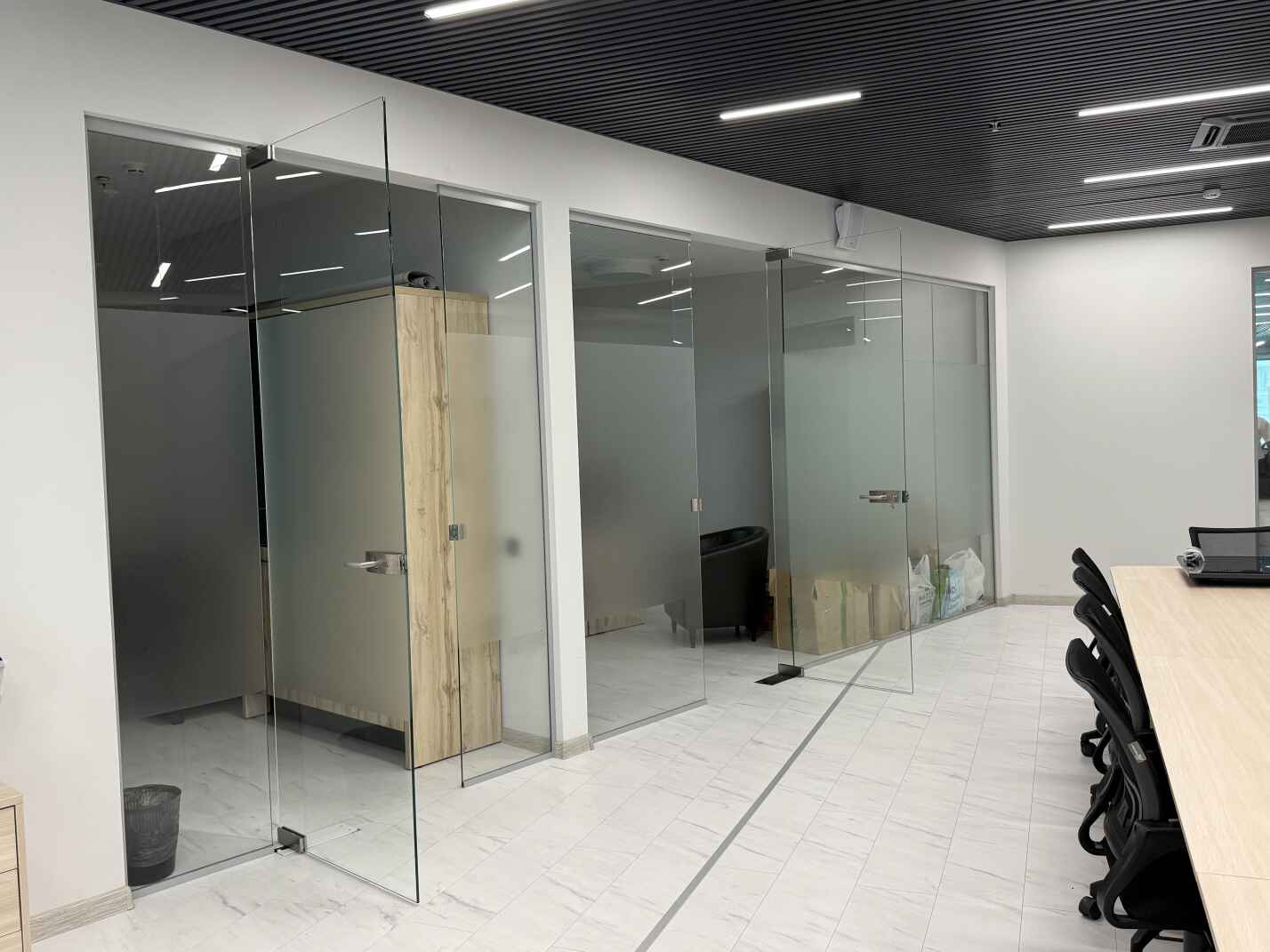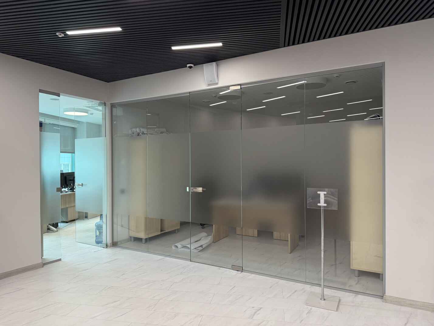 Для главной зоны была спроектирована цельностеклянная система с использованием закалённого стекла толщиной 10 мм. Надёжность, минимализм, визуальная легкость — эта комбинация стала логичной для задач заказчика. Поверхность стекла мы обработали матовой плёнкой: пространство сохранило свет, но приобрело приватность. На вторую часть помещений легла каркасная система из профиля 40 М3 с полотнами Double Vitrage — стандартный размер 830*2050, цвет RAL 9006. Строгая геометрия и уверенная линия алюминия помогли задать помещению ритм.