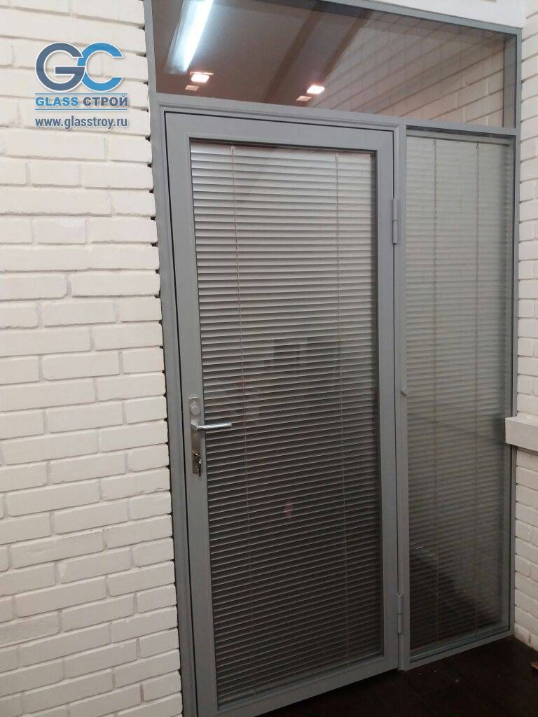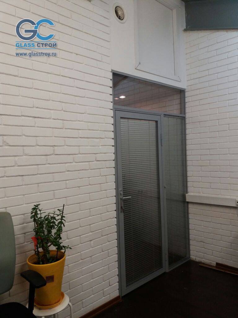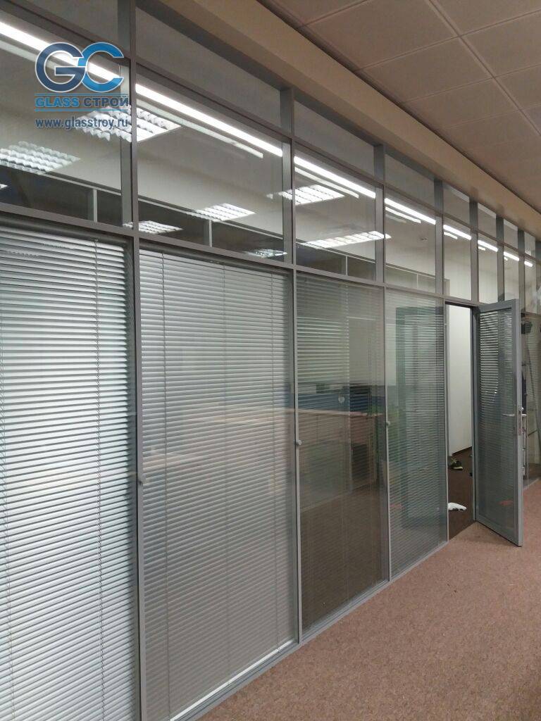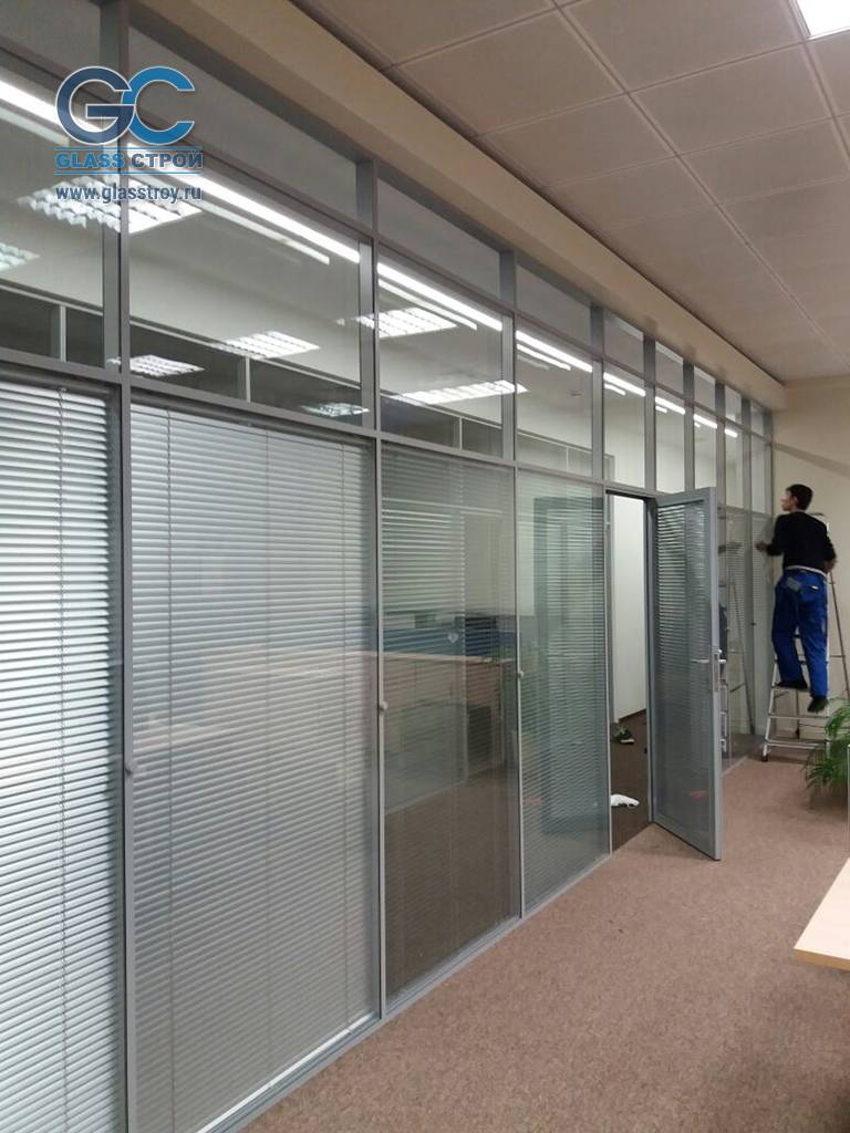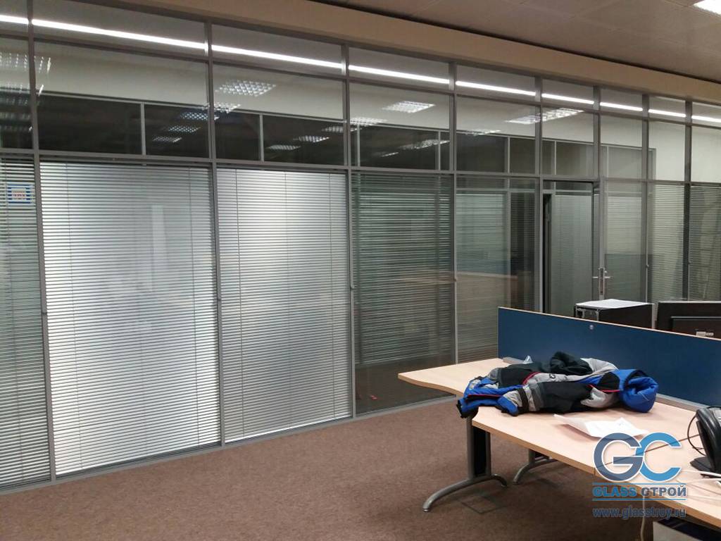 Для формирования комплекса офисных помещений, предложено смонтировать каркасные перегородки с двойным остеклением, а в межкаркасное пространство установить алюминиевые жалюзи с двойной рассечкой. Сам каркас предложено выполнить из легких и прочных алюминиевых конструкций. Двери предложено установить стеклянные распашные.
