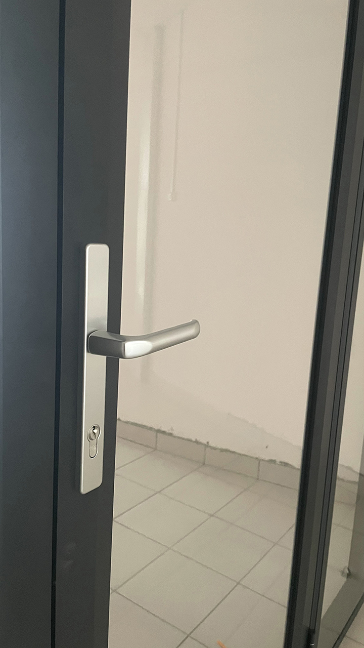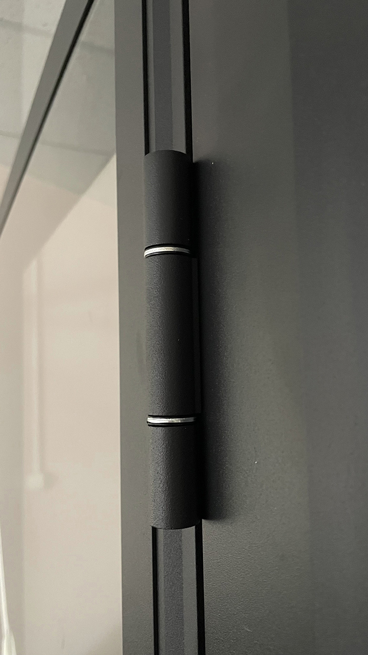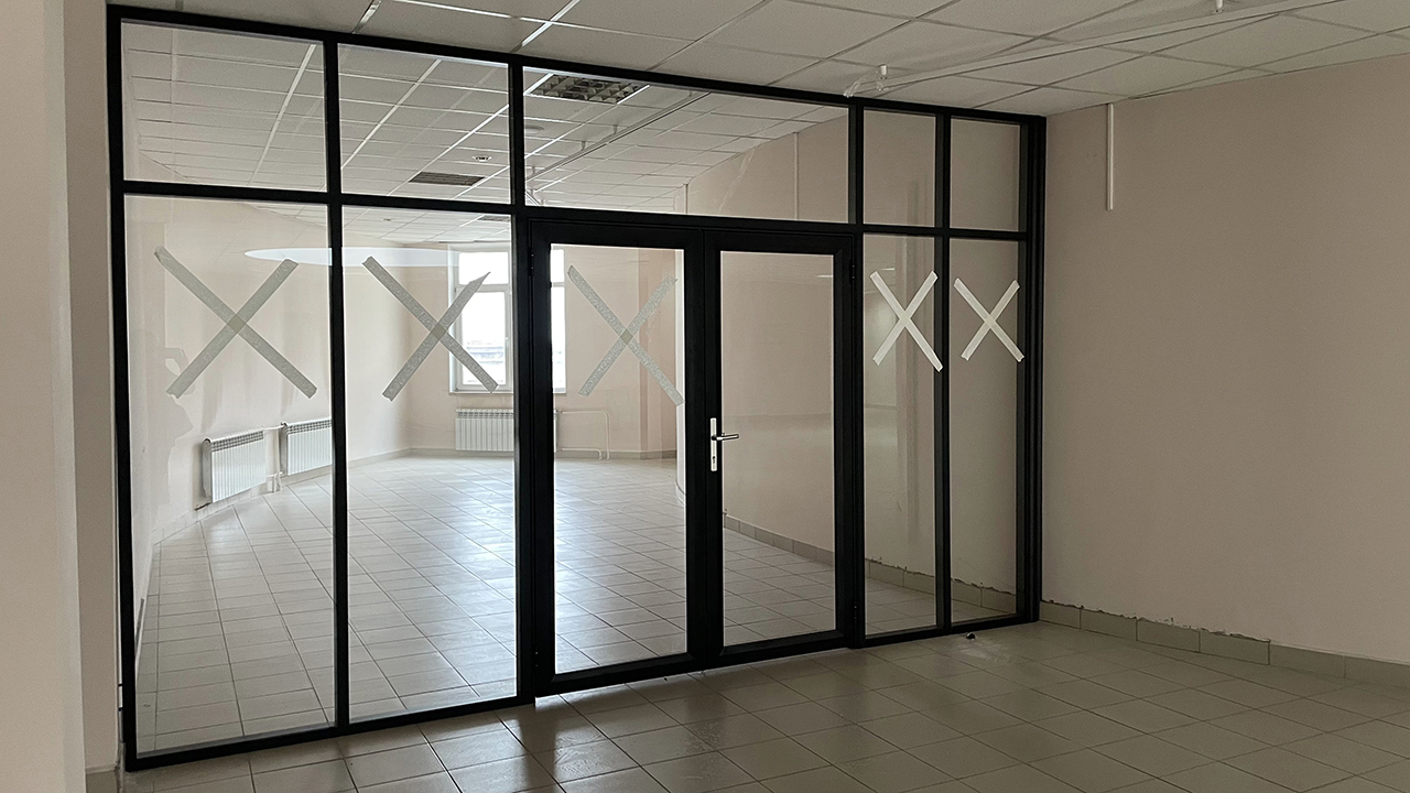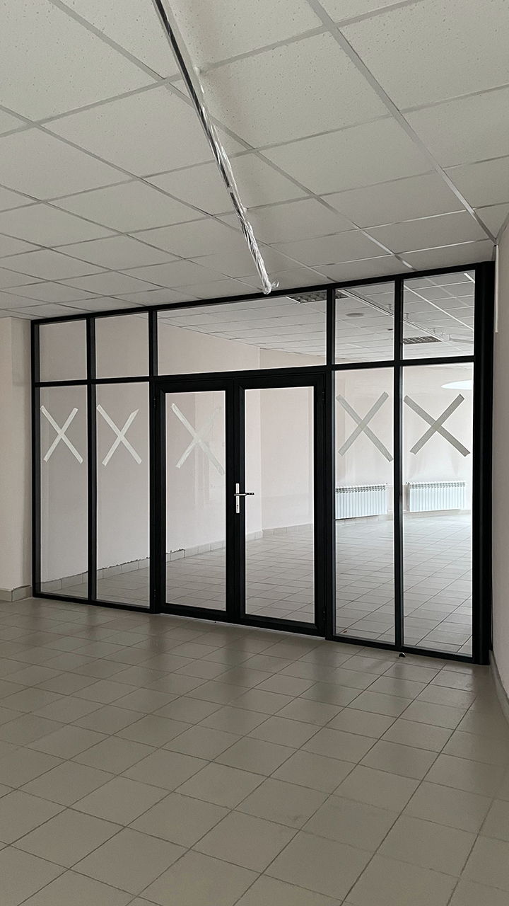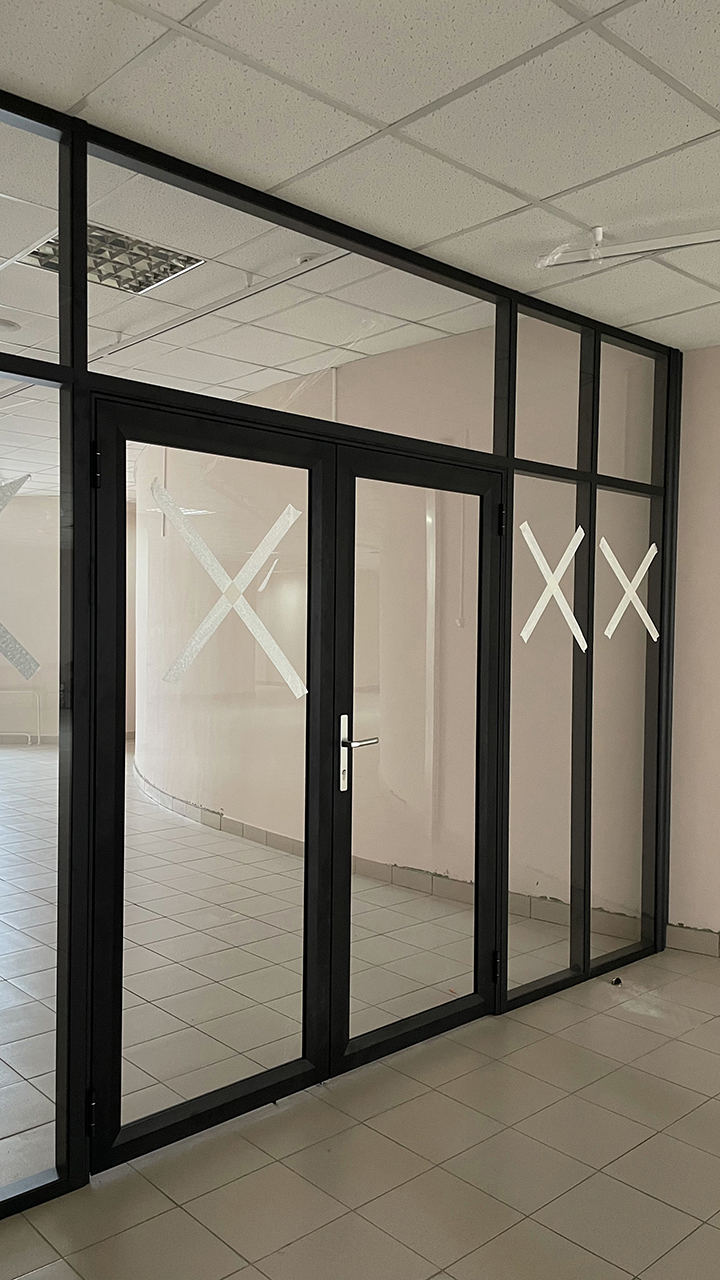 Профили покрыли декоративной порошковой эпоксиполиэфирной краской серого цвета RAL 9006. Монтаж дверей выполнили с помощью усиленных навесных петель. Добавили дверную фурнитуру в виде нажимных ручек со встроенным замком. Благодаря этому получили отдельные кабинеты, которые можно запирать на ключ, ограничивая доступ в помещения.