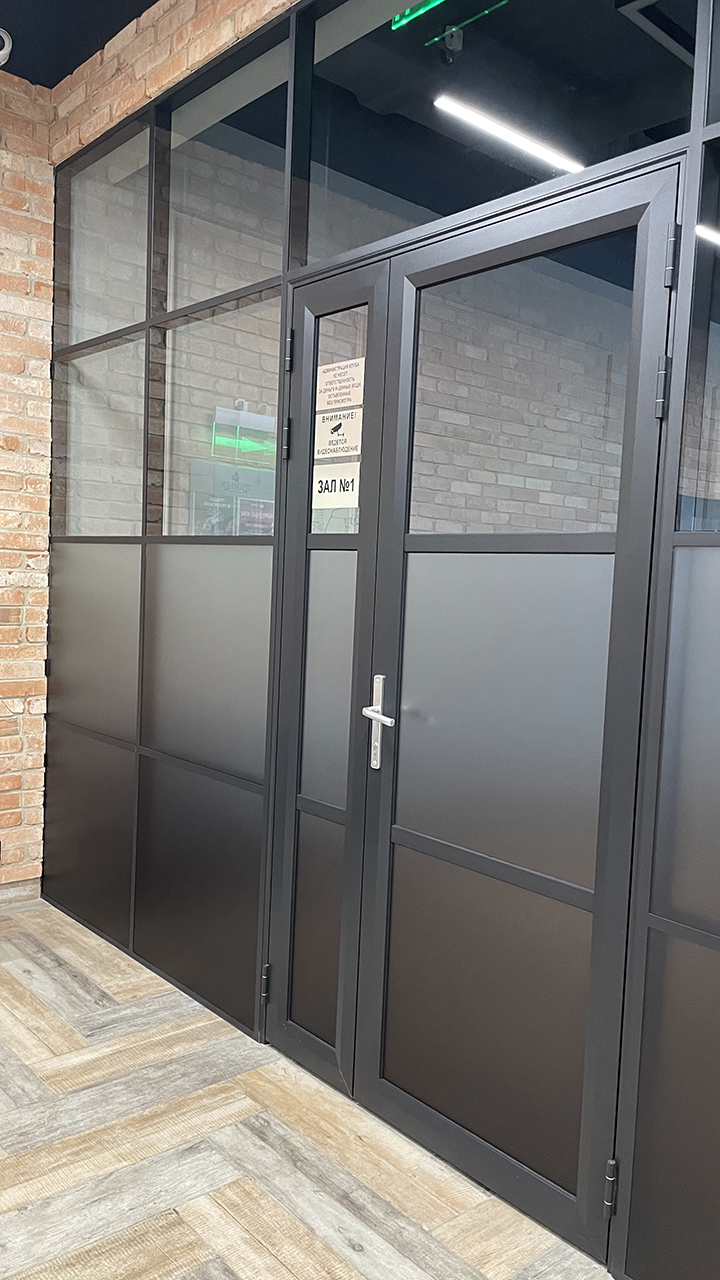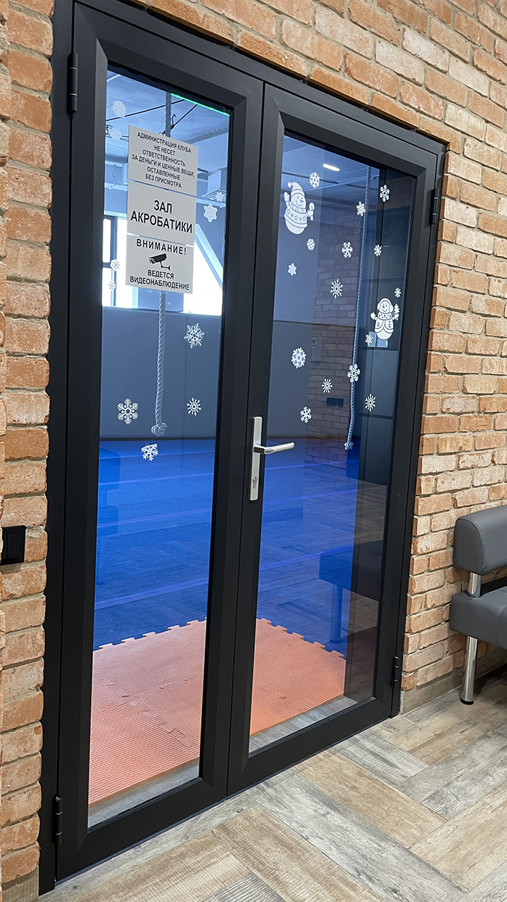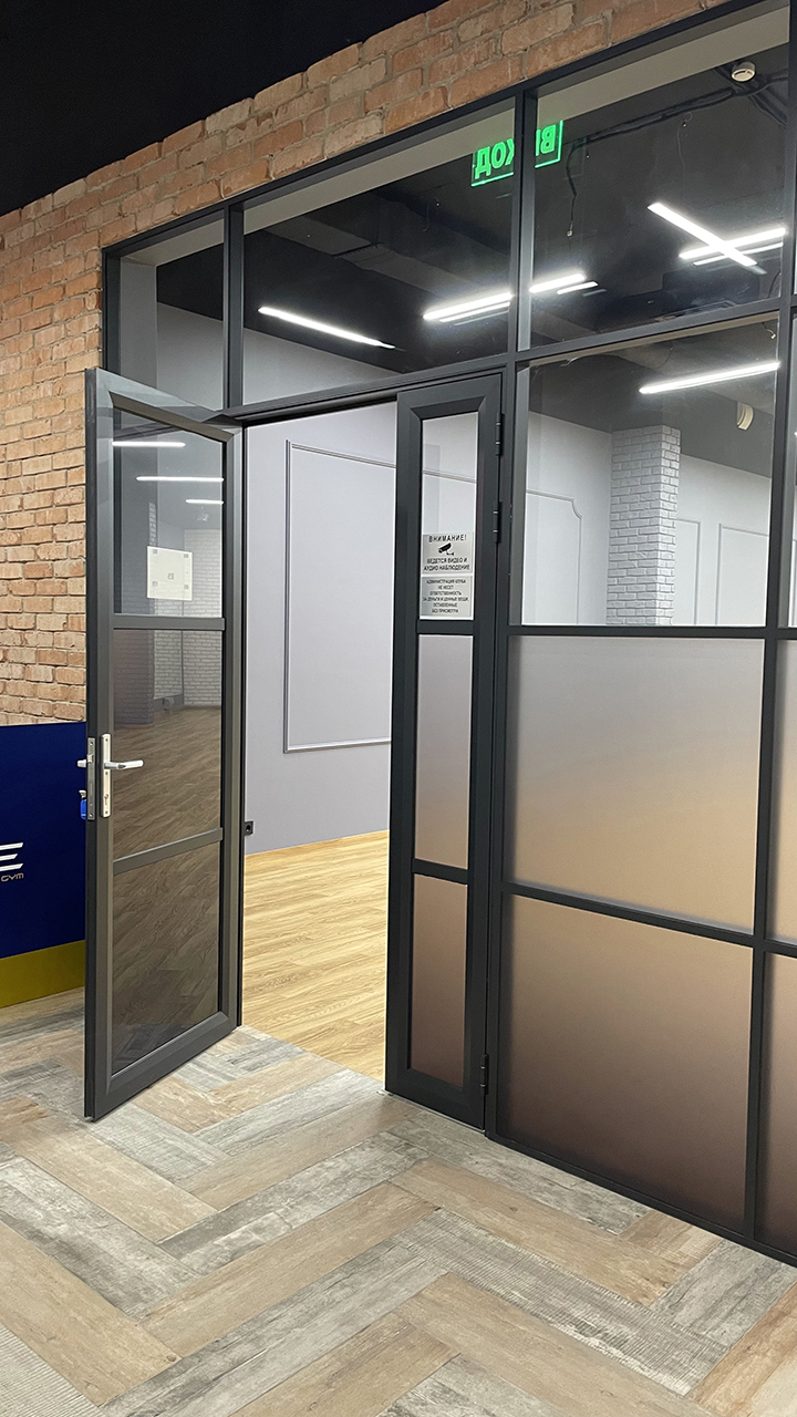 Монтаж выполняли в помещениях со сделанным ремонтом, подготовленными поверхностями. Учли не только пожелания нашего клиента, но и все меры безопасности касательно каркасных конструкций. Двери в залы сделали двустворчатыми распашными на трех усиленных петлях.