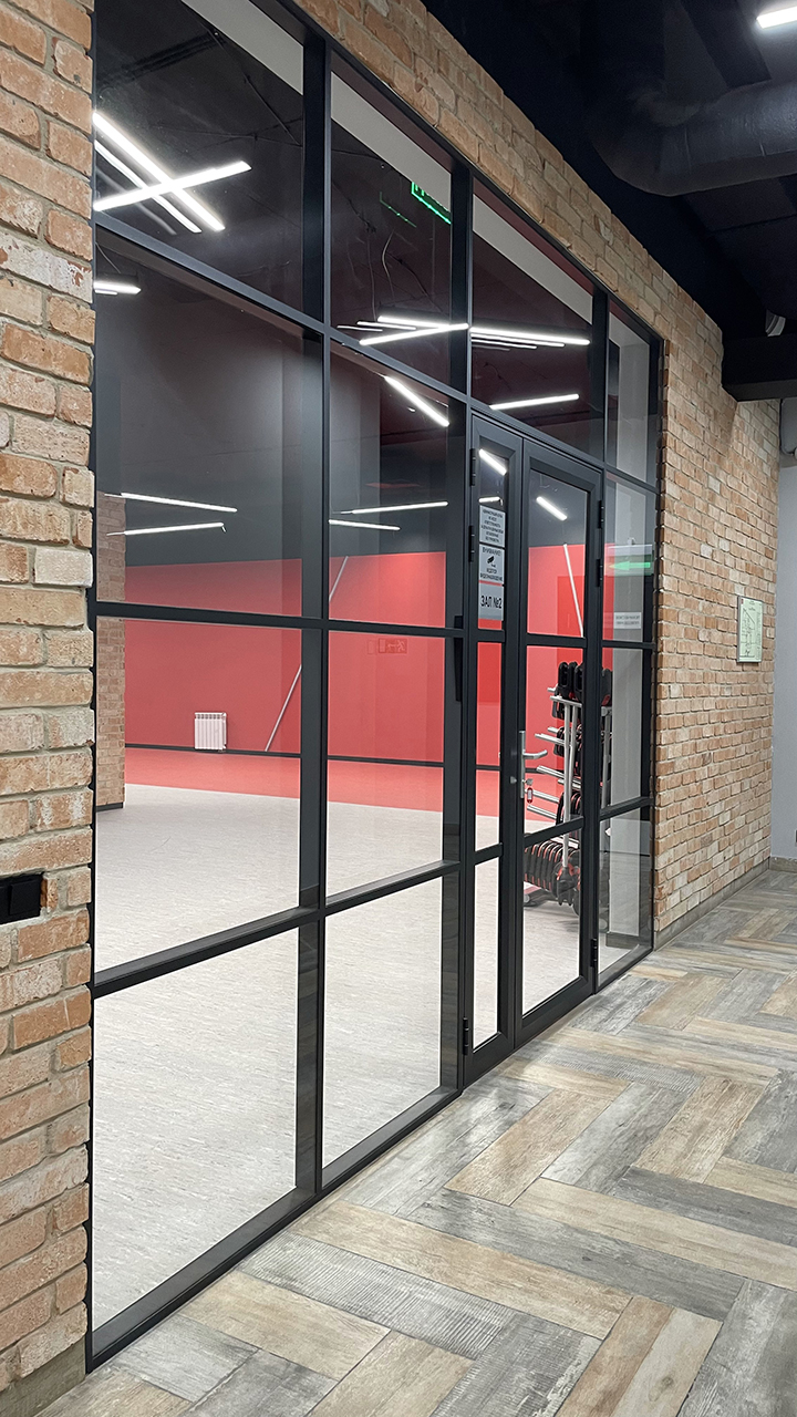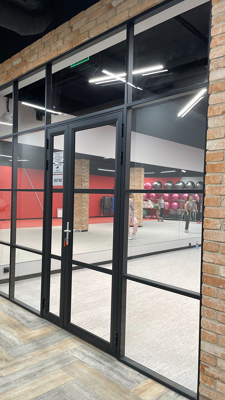 - каркасные перегородки для залов по групповым занятиям – общая площадь остекления 85 м2;