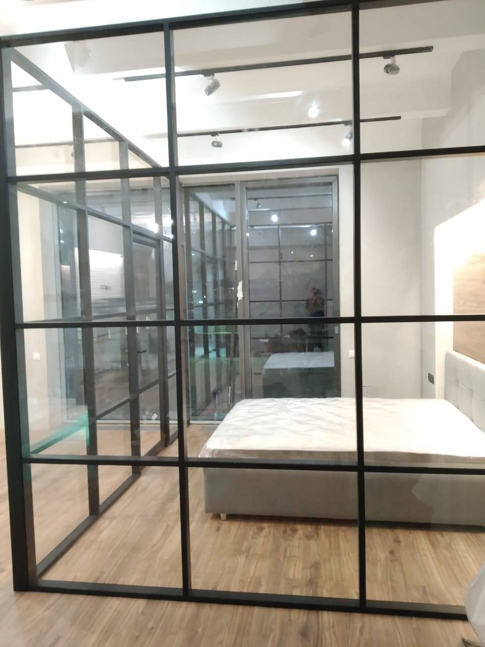 Снова профиль черного цвета, снова стеклянные перегородки в стиле loft.