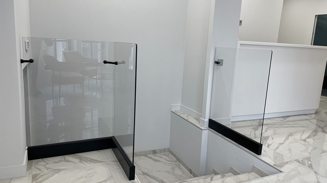 - стеклянное ограждение, установленное с помощью нижнего зажимного профиля;