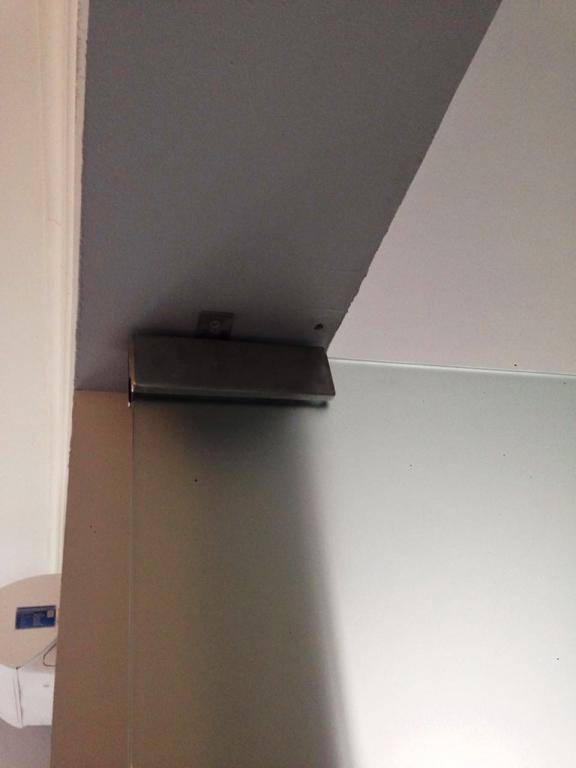 Цельностеклянные двери смонтированы в дверной проем при помощи верхних и нижних фитингов. В систему установлен ограничитель, поэтому дверь эксплуатируется как традиционная распашная.