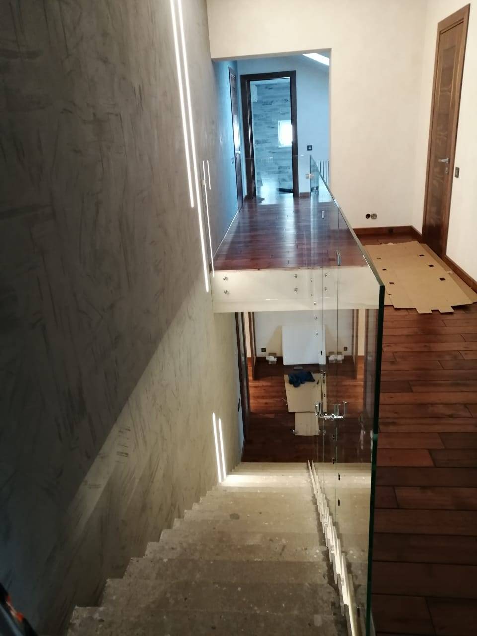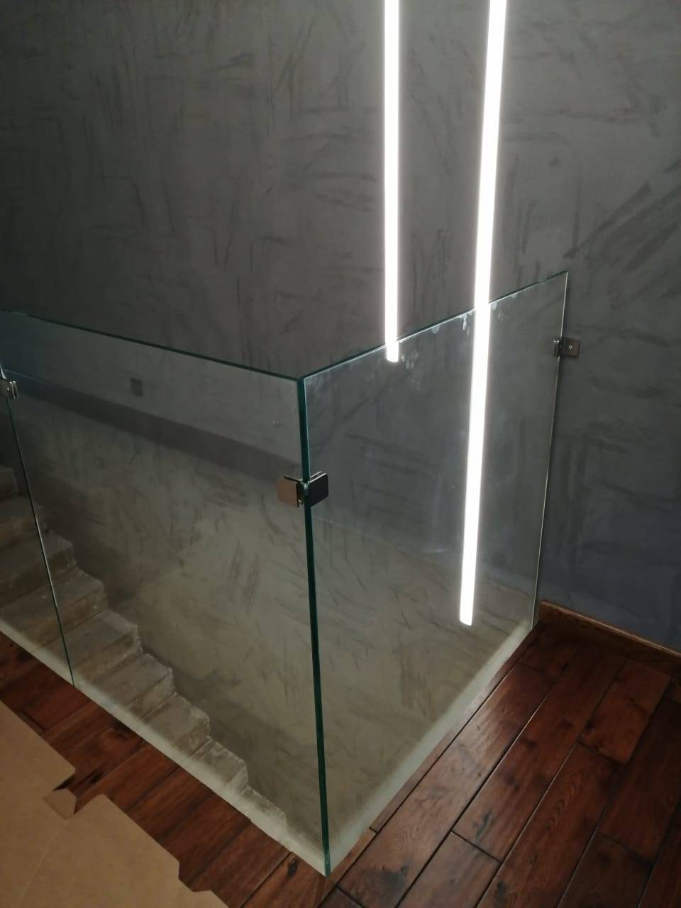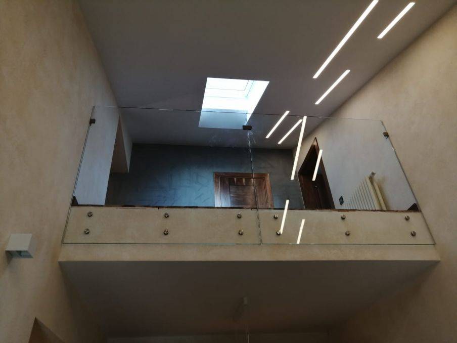 - «Для изготовления стеклянных ограждений мы использовали осветленное закаленное стекло толщиной 12 мм», - рассказывает Фарфутдинова Рамиля. - «Материал отлично дополнил фасад и не испортил эффектный интерьер коттеджа. Чтобы не нарушать облицовку ступеней в доме, а также сохранить целостность покрытия пола на террасе, балконе, было принято решение использовать торцевые крепления. Для этого стеклянные панели еще до момента закаливания были просверлены под точечные крепления типа manet.