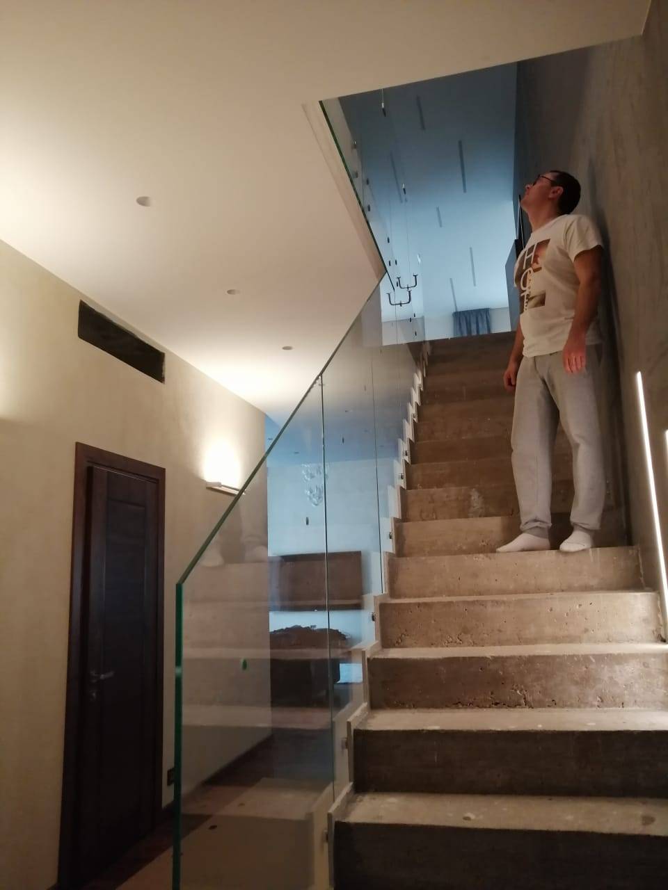 - «Мне очень нравится стекло, как материал. Поэтому, террасы, балкон и лестницу в доме я решила оградить именно прозрачными перилами. Оставался только вопрос, каким способом закрепить стеклянные ограждения так, чтобы не повредить напольное покрытие», - делится с нами Марина Александровна. - «Рамиля Зинуровна быстро подсказала приемлемый для меня вариант и через полчаса прислала проект. Меня абсолютно все устроило, включая очень быстрый и действительно аккуратный монтаж».