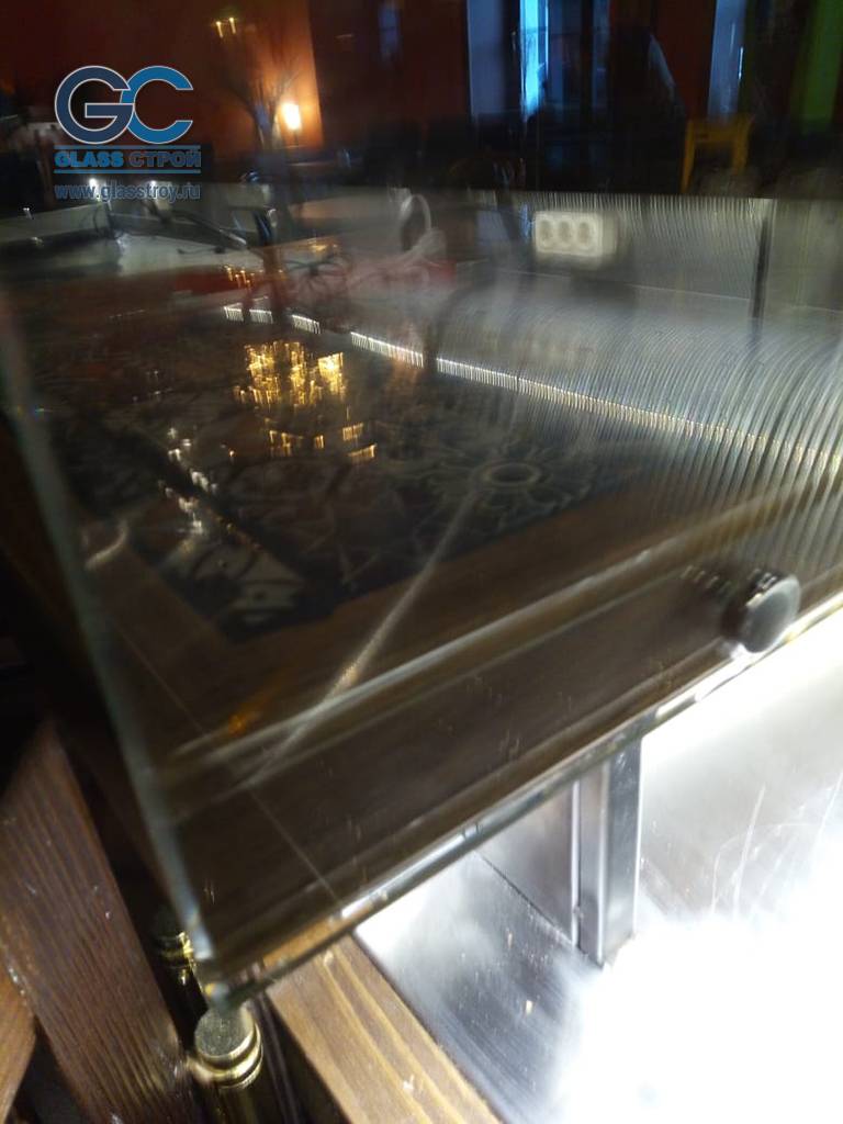 Фурнитуру для фиксации стекол решили выбрать под хром. Также учли популярность заведения и активную посещаемость. Поэтому стеклянные кромки защитили от возможных повреждений и вероятности травматизма клиентов.