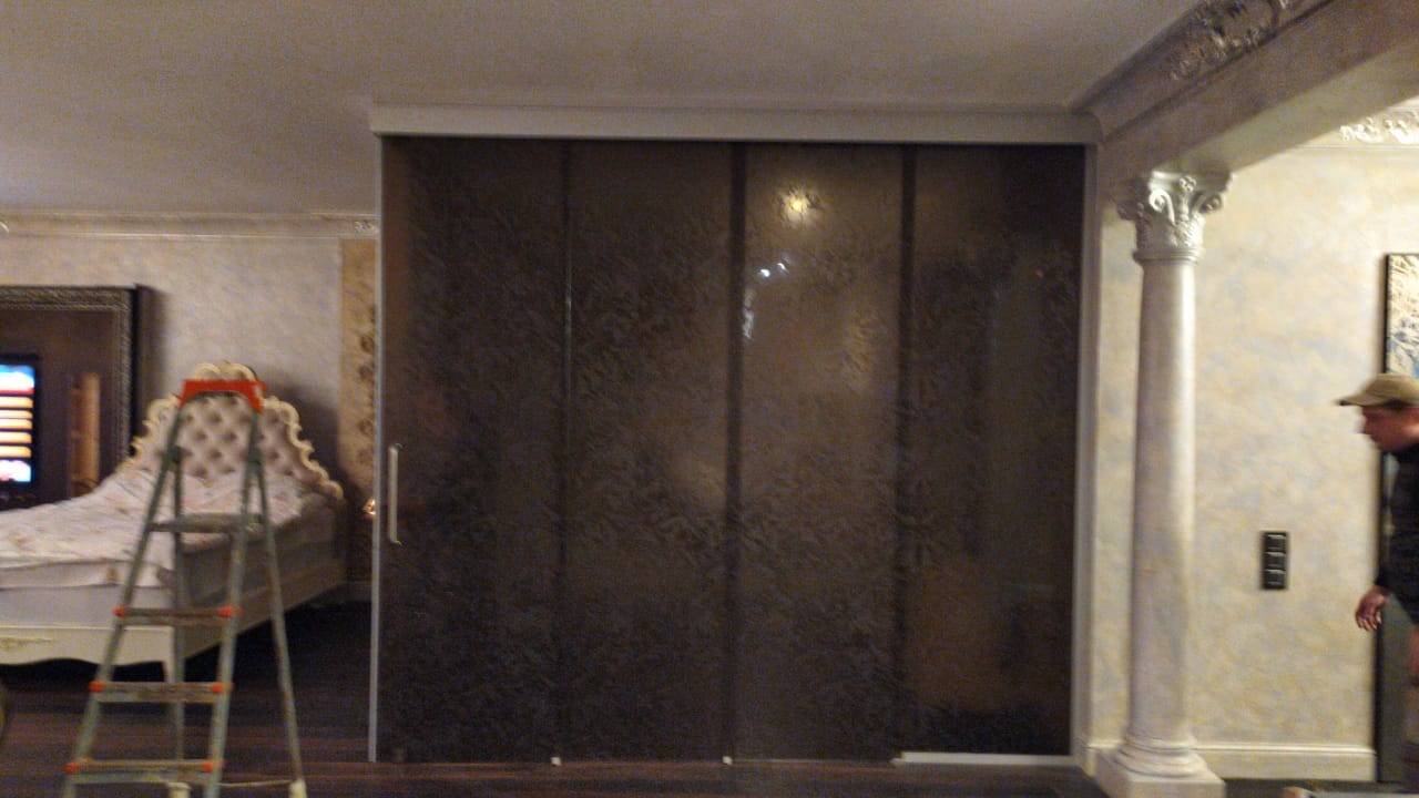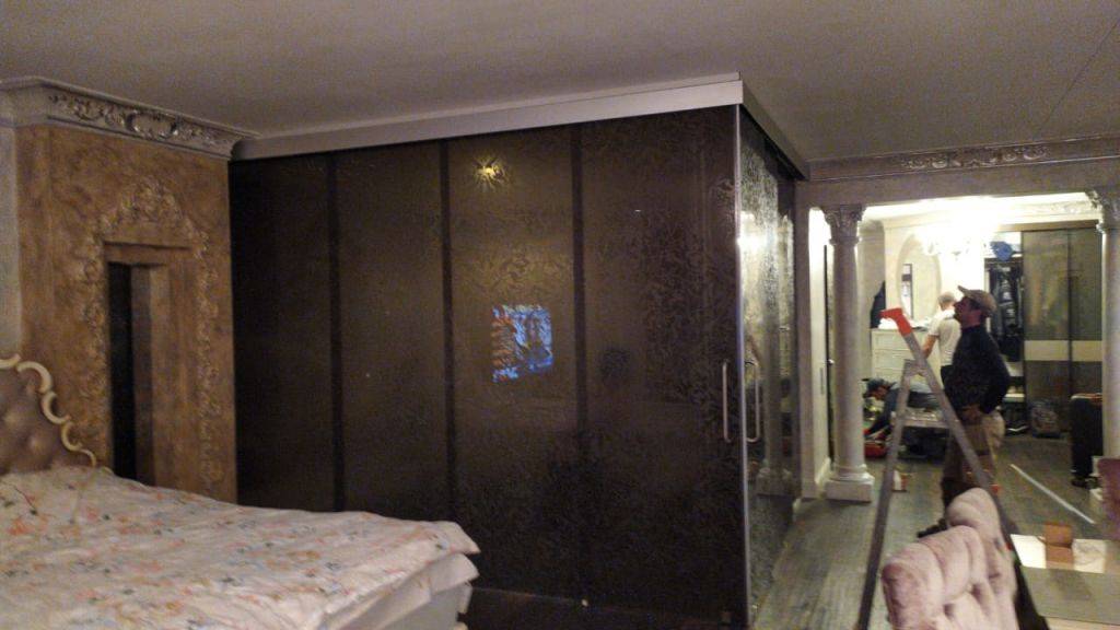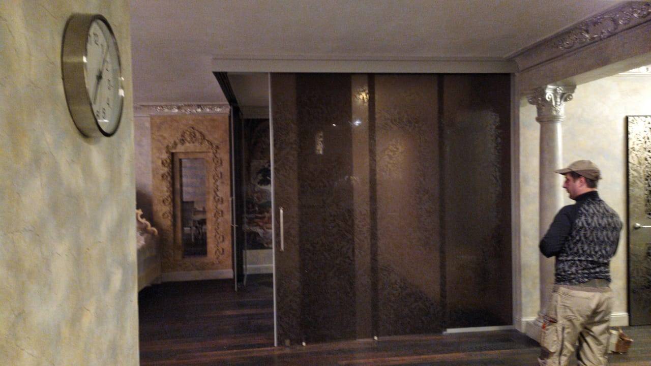 Для изготовления перегородки было выбрано стандартное 8-миллиметровое закаленное стекло. Чтобы снизить обзор ограниченной территории, мы решили окрасить стекло в массе под бронзу, которая отлично сочетается с общим стилем интерьера. Тем более, что высота потолков 2,82 м позволяет использовать цветные панели, не создавая ощущение сдавленного пространства. Предложили дополнительно нанести на бронзовую поверхность пескоструйный рисунок.