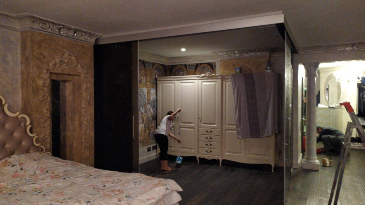 - «Лучшим вариантом для оборудования просторной однокомнатной квартиры действительно являются бескаркасные стеклянные перегородки», - подтверждает Логинова Екатерина. - «У нас получилась угловая конструкция с достаточно широким проемом. По технологии такой проем лучше всего закрывать раздвижной дверью. Мы выбрали телескопическую конструкцию с верхней направляющей. Таким способом сохранили в целостности поверхность уже облицованного пола, избежали наличия не всегда удобного порога».