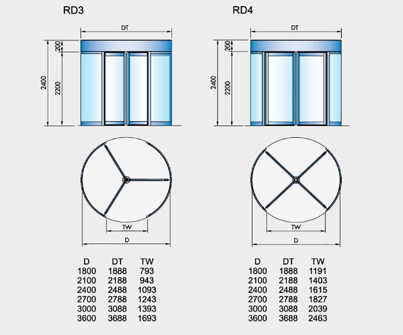 Идя навстречу заказчикам, Бесам выпускает двери RDЗ/RD4 нескольких конфигураций. На выбор предлагаются два варианта неподвижной части и три варианта вращающихся створок. В зависимости от выбранного типа профиля и заполнения, дверь может соответствовать интерьеру зданий любого уровня. Заказывая двери разного диаметра, изменяя высоту прохода и габариты двери, Вы обязательно подберете дверь под Ваши требования.