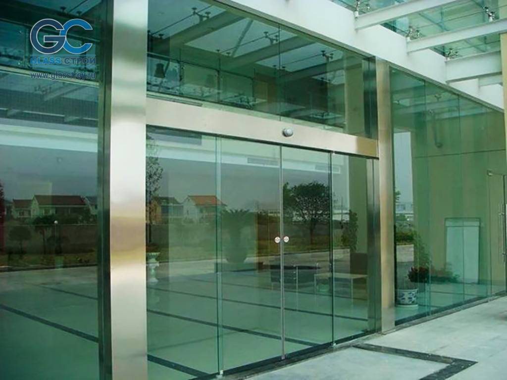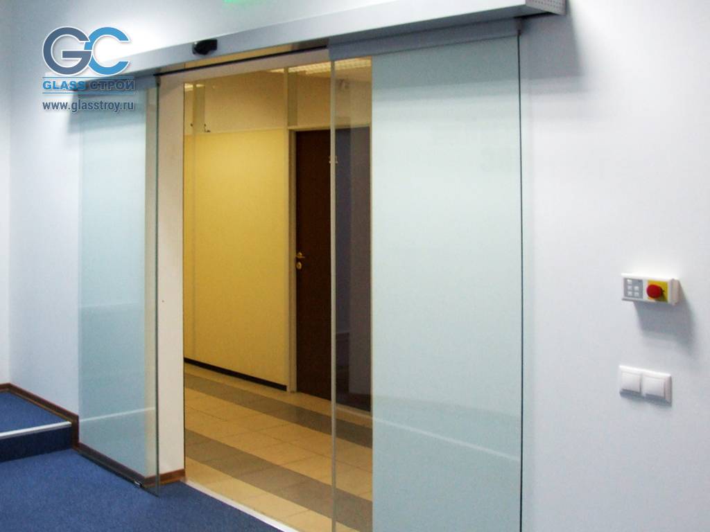 Компания Glass Строй производит и монтирует раздвижные цельностеклянные автоматические двери, используя операторы Dorma и других производителей.