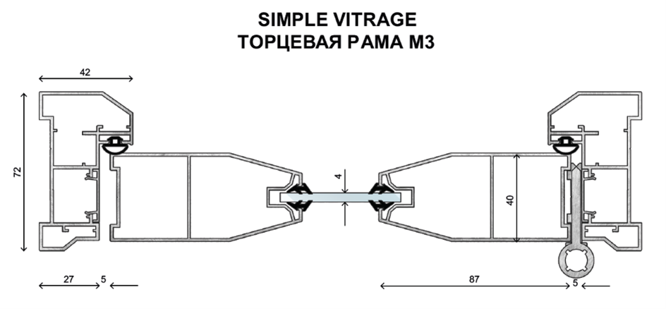 Система М3, толщиной 75мм, видимая часть профиля с фасада стекла 26 или 40мм