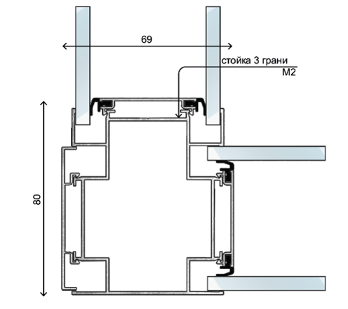 Система М2, толщиной 65мм (визуально более лёгкая), видимая часть профиля с фасада стекла 26 или 40 мм
