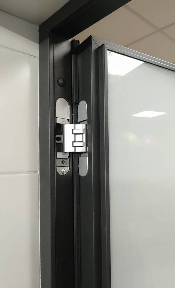 В дверное полотно и коробку Concept М1 есть возможность установить скрытые петли и скрытый доводчик, которые устанавливаются с торца полотна и полностью врезаются в профиль коробки и профиль полотна двери (не видимы при закрытой двери). Это решение добавляет внешнему виду данного типа двери простую эстетику,