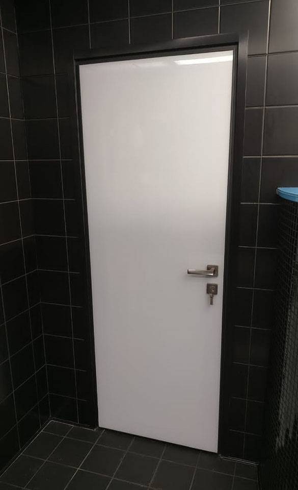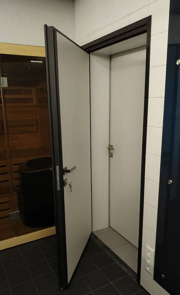 Дверь включает в себя немецкий нажимной гарнитур из шлифованной нержавеющей стали на раздельных розетках и немецкий механический замок Hafele, который зарекомендовал себя безотказной работой в любых условиях на объектах. Плавный ход и примыкание полотна к дверной коробке обеспечивается одинарным контуром уплотнительной резины.