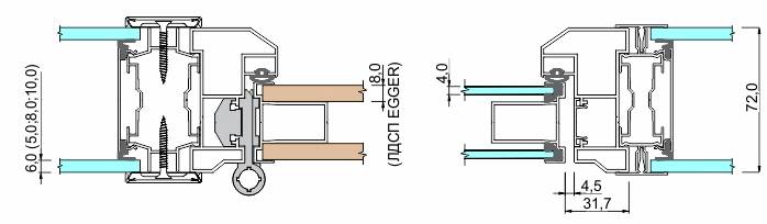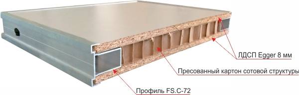 В качестве заполнения полотен использованы панели ЛДСП Egger толщиной 8 мм с внутренней проставкой из прессованного картона сотовой структуры. Ниже, приведено сечение дверного полотна Эстет Decor.