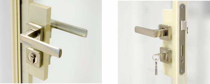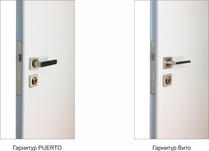 Базовый комплект фурнитуры состоит из ручки дверной и квадратной накладки на цилиндр (цвет – «сталь полуполированная»), замками, профильного цилиндра и ответной планки.