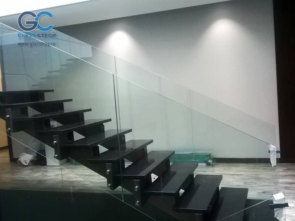 - Установка стеклянных ограждений производится как к торцу лестничного марша, так и непосредственно на ступень лестницы, в зависимости от выбранной фурнитуры;