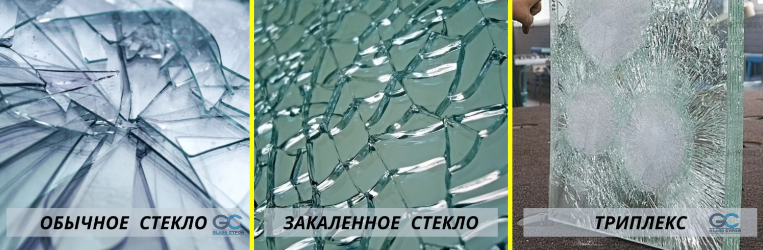 Закалённое стекло - при разрушении разбивается на небольшие кубические осколки, которые не наносят вред здоровью, в отличии от обычного незакалённого стекла.
