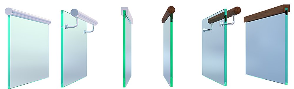 Чтобы конструкция стеклянных лестничных ограждений после установки стала монолитной единой по всей длине, применяют установку верхнего поручня непосредственно на верхнюю кромку стекла. Поручень можно изготавливать из различных материалов, таких как алюминий, нержавеющая сталь или дерево, различных конфигураций: круглый, квадратный, прямоугольный или П-профиль.