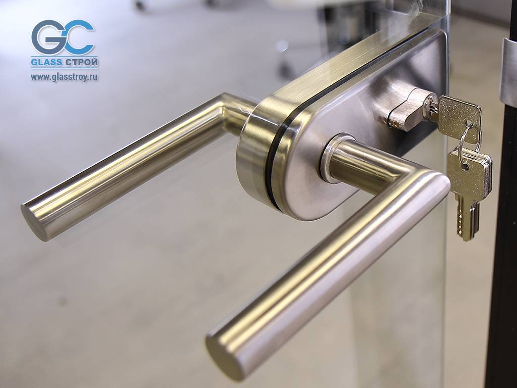 Используется та же фурнитура, что и на маятниковых дверях, но устанавливается ограничитель открывания, который устанавливается в проём или на фрамужное стекло сверху цельностеклянной двери.
