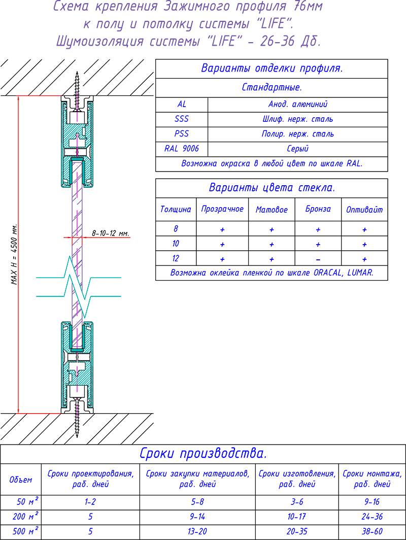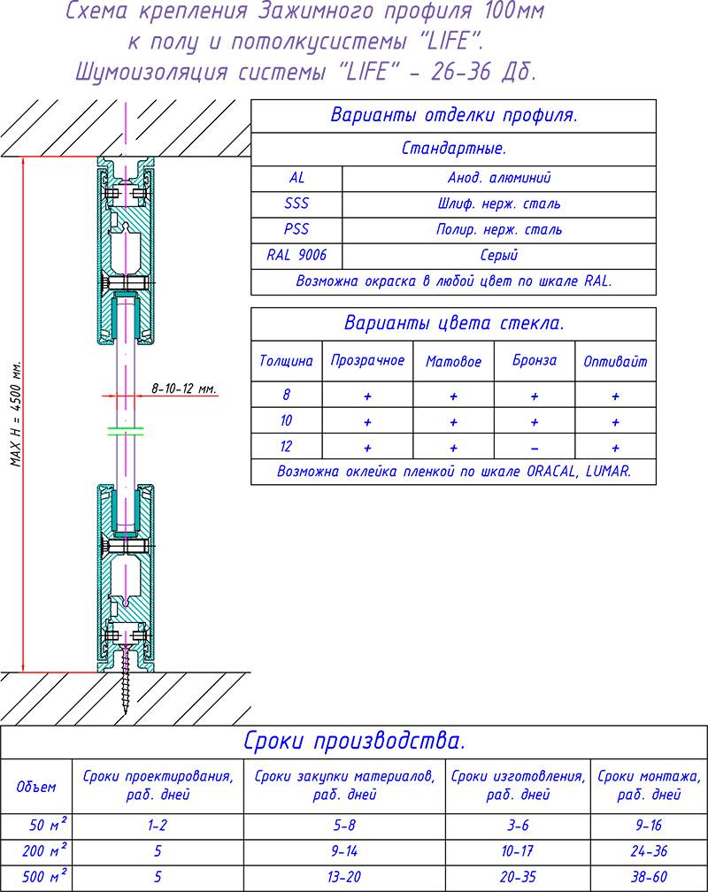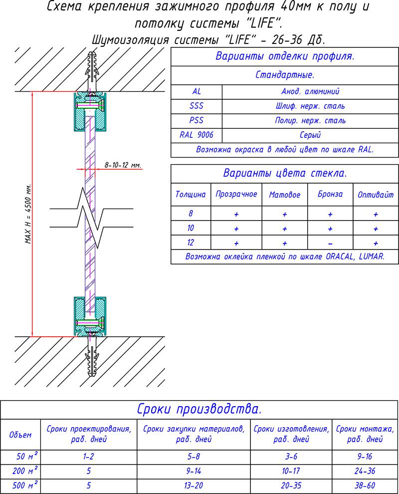 В зависимости от выбора варианта крепления у цельностеклянных перегородок изменяется индекс звукоизоляции, максимальное значение достигается при установке стекла на зажимном профиле.