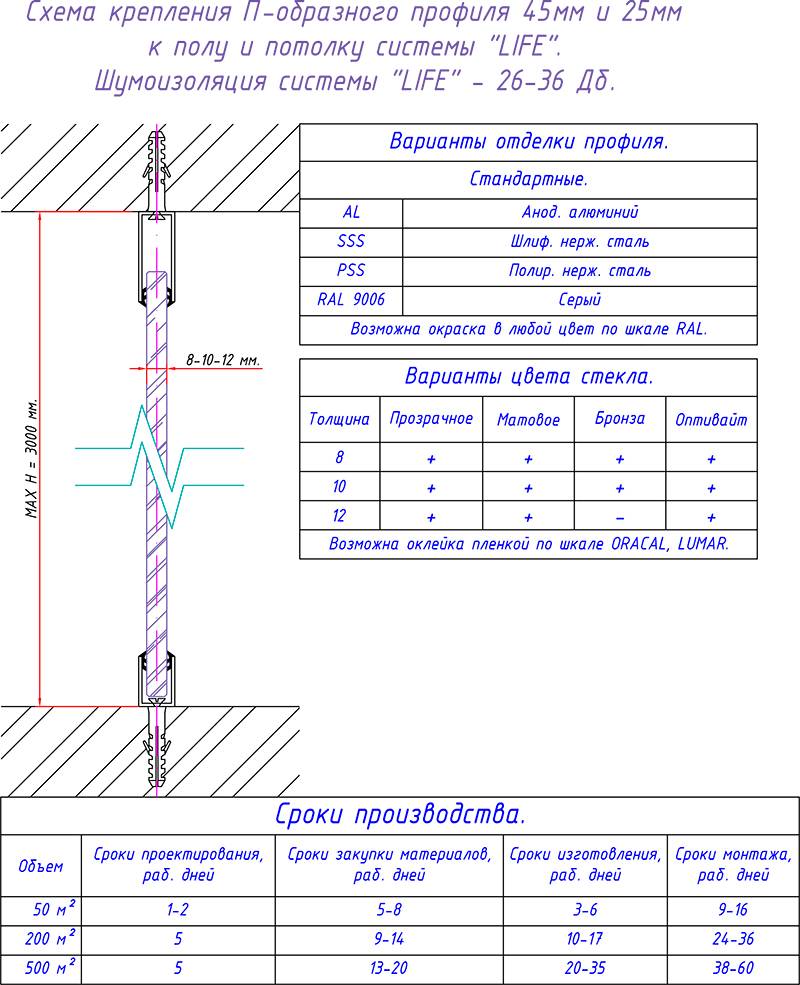 Перегородки Life представляют собой сплошную конструкцию, состоящую из секций стеклянных полотен, установленных с зазором в 2 мм между собой, зазор заполняется прозрачным 3М скотчем, который стягивает всю стеклянную конструкцию в единую стеклянную стену. Стандартные габариты ширины стекла от 350 мм до 1100-1200мм.