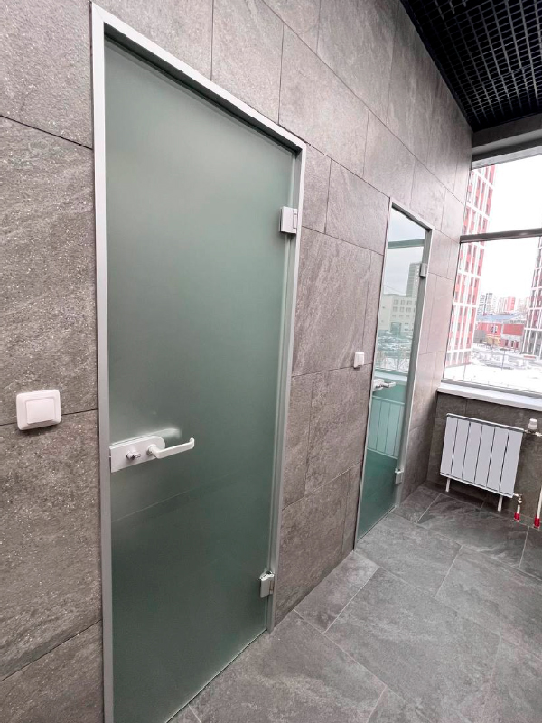 При установке цельностеклянной двери в проём, используется алюминиевая дверная коробка с притвором, боковые петли и нажимной гарнитур.