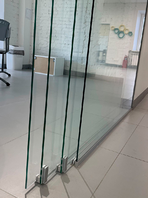 Используется безопасное закалённое стекло, толщиной 10мм, качественная фурнитура из шлифованной нержавеющей стали. Легкое решение разграничения пространства. Перегородка складывается около стены и занимает минимальное количество пространства в сложенном состоянии.