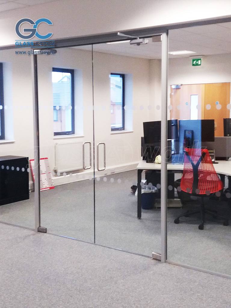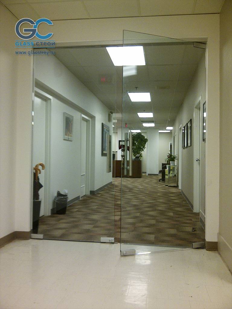 Маятниковые двери компании Glass Строй системы Ultra slim делаются из цельного полотна закаленного безопасного стекла (без коробки) и монтируются на двух креплениях, встроенных в пол и потолок, которые представляют собой ось вращения двери. В пол монтируется скрытый доводчик, обеспечивающий плавное закрывание и фиксацию двери.