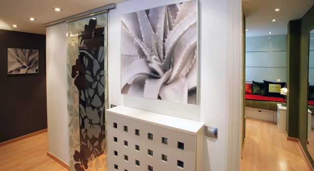 Рис. 3. Отделить часть помещения в офисе можно с помощью декоративной раздвижной стеклянной перегородки. Рисунок нанесен пескоструйным методом.
