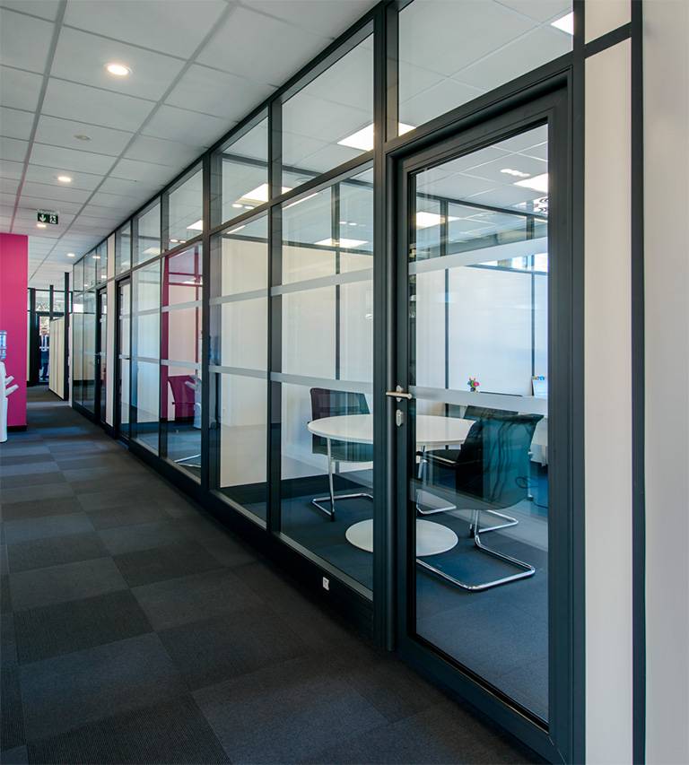 Они используются в качестве полноценных перестенков, которыми делят офисы на рабочие зоны, изолируют кабинеты руководителей и комнаты переговоров. Внешний вид алюминиевых перегородок тоже бывает разным. Эффектнее всего смотрится заполнение из каленого стекла. Но, варианты комбинированного или глухого типа дизайнеры тоже не отбрасывают. Это позволяет немного сэкономить на расходных материалах и частично/полностью исключить обзор помещения снаружи. Также глухие и комбинированные перегородки из алюминиевого профиля привлекают: