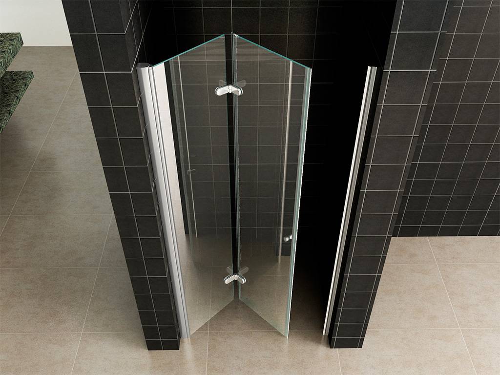 Выбираются стеклянные складные двери для душа по размерам проема. При габаритах последнего 2,0*0,9 м используют полотна толщиной в 8 мм. При этом ширина створки не должна превышать 0,45 м. Если проем шире, тогда используют полотна толщиной в 6 мм и крепят их на 3 петли. Таким способом снижается вес самой конструкции и нагрузка на фурнитуру.