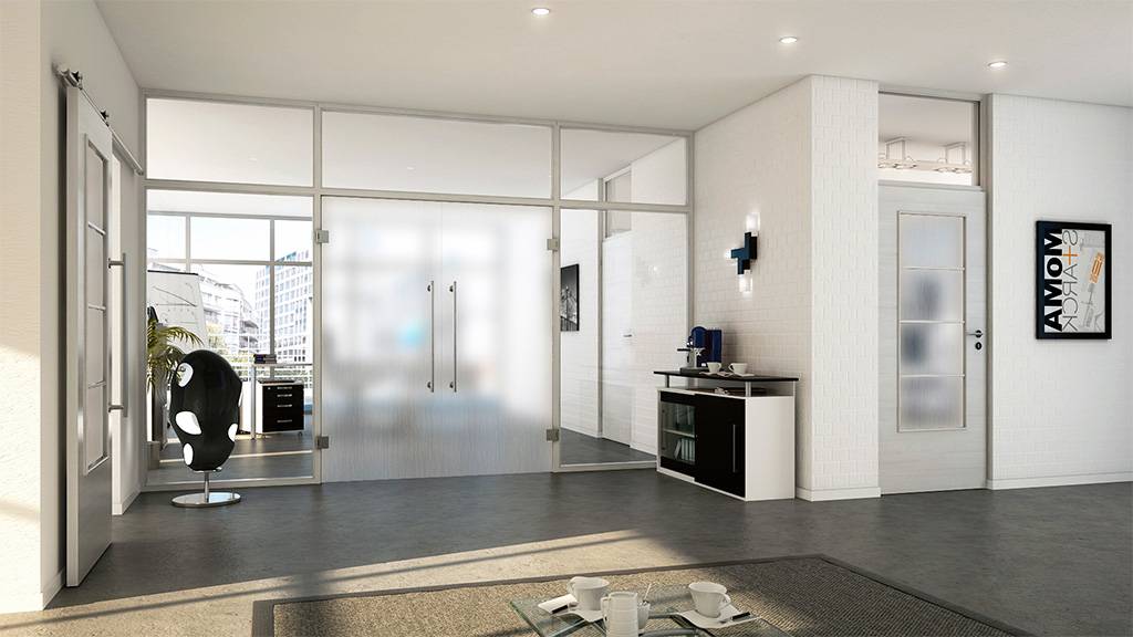Таким образом можно установить стеклянные перегородки в классических и современных стилях. Для оформления строгих интерьеров отлично подойдут стеклянные перегородки в черном профиле, а также в нейтральных тонах.
