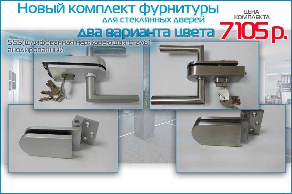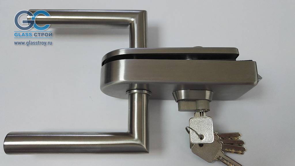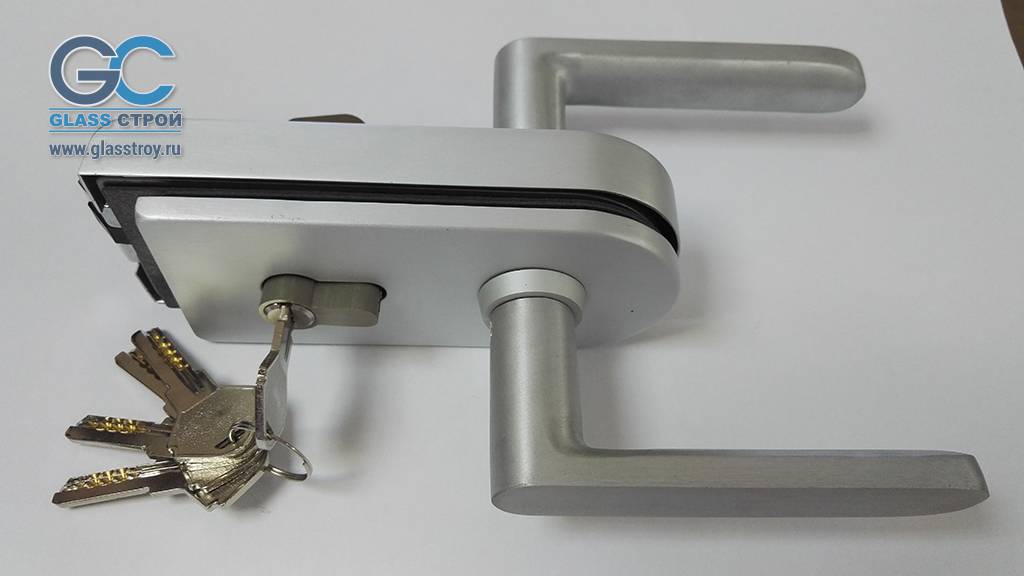 Комплект фурнитуры - замок и петли (GLD 86 и GLD 80) для стеклянных маятниковых дверей.
