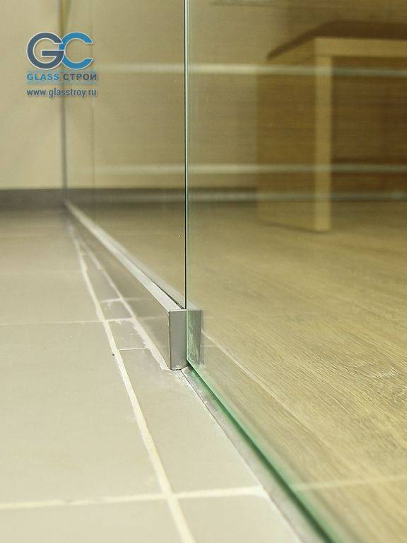 При стандартных условиях монтажа используется распространенный зажимной профиль для стекла 8 мм. Он отличается невысокими стенками в 4 см и аккуратно смотрится в любом помещении. Фурнитура способна удерживать и более толстые закаленные полотна в 10 – 12 мм без дополнительных крепежей. Такие хлысты изготавливаются длиной в 3 м и нарезаются кусками, кратными метру. Может монтироваться прямо к поверхности пола, стены или совсем не выглядывать наружу, если установлен следующим способом: