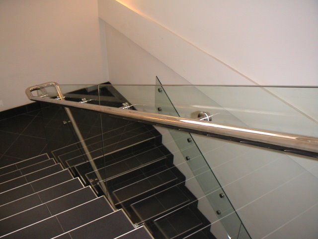 Это дает возможность сделать всю конструкцию в единой плоскости. Достигается это регулировкой вертикальности каждого стекла при монтажа. Поручень при этом может крепиться на торец стекла или на выносных кронштейнах. Такой тип перил не перегружает интерьер визуально — что для несколько стилей, таких как минимализм и хай-тек, является значимым.