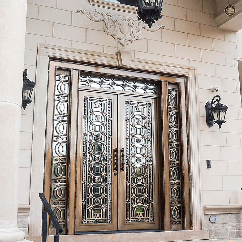 Важно: дверное полотно, украшенное ковкой, обладает большим весом и создает дополнительную нагрузку на конструктивные узлы. Поэтому усиливают жесткость каркаса, используют прочные флажковые петли. Кованые элементы можно окрашивать или наносить патину под золото, серебро.