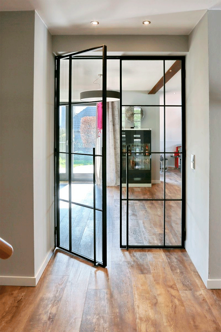 Для широких проходов подходят двустворчатые модели. Двойные полотна с фрагментами из стекла пропускают много света, выглядят благородно, воздушно, современно. Для более качественной звукоизоляции используют профилированные системы с несколькими камерами и вспомогательным изолятором в основе.
