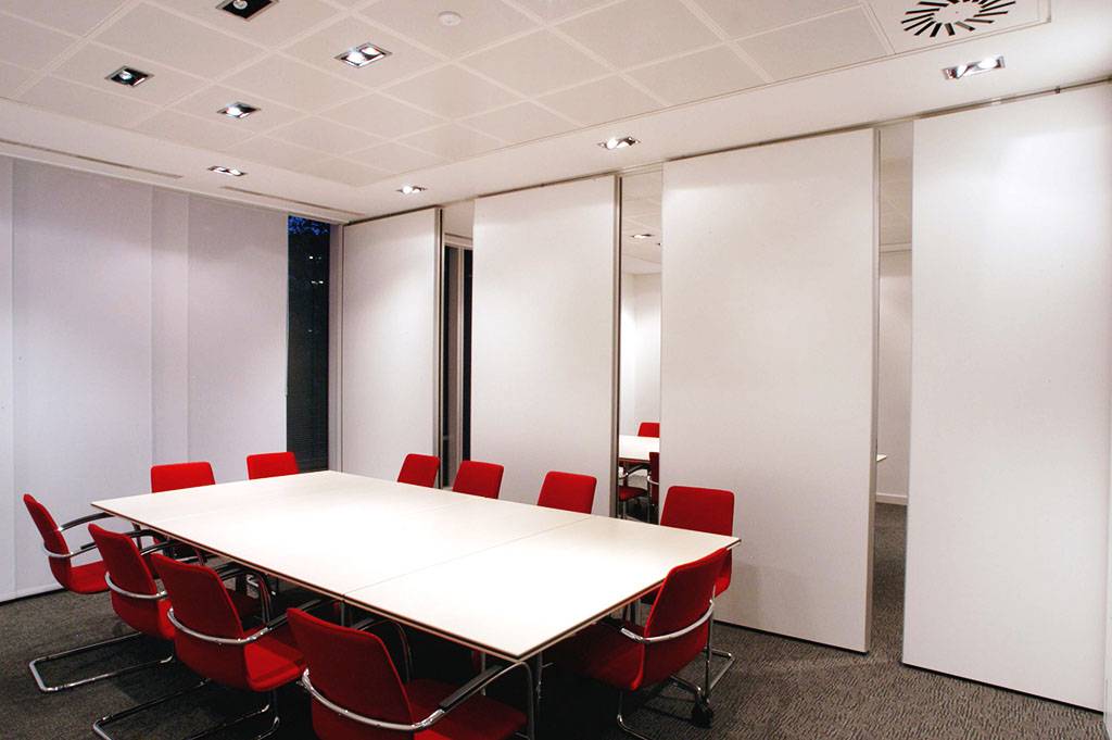 Для оснащения офисных помещений, используется несколько типов стеклянных перегородок. Трансформируемые конструкции производятся из отдельных полотен, перемещающихся по особым рельсам, которые закреплены на потолке. Используются в просторных помещениях при необходимости быстро разделить большую площадь на зоны.