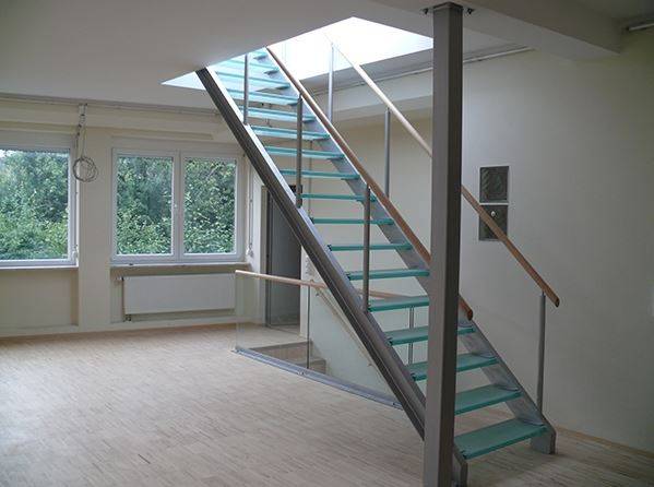 Недостаток косоуров как конструктивного элемента для стеклянных лестниц – это их тяжеловесность. Соответственно и возможное место их применения достаточно ограничено. Только там где есть большая площадь разрешается устанавливать этот тип лестницы.