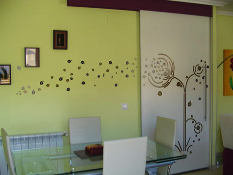Рис. 4. Стеклянная раздвижная дверь с нанесенной фотопечатью на роликовом механизме. Дизайн в продолжение рисунка на стене.