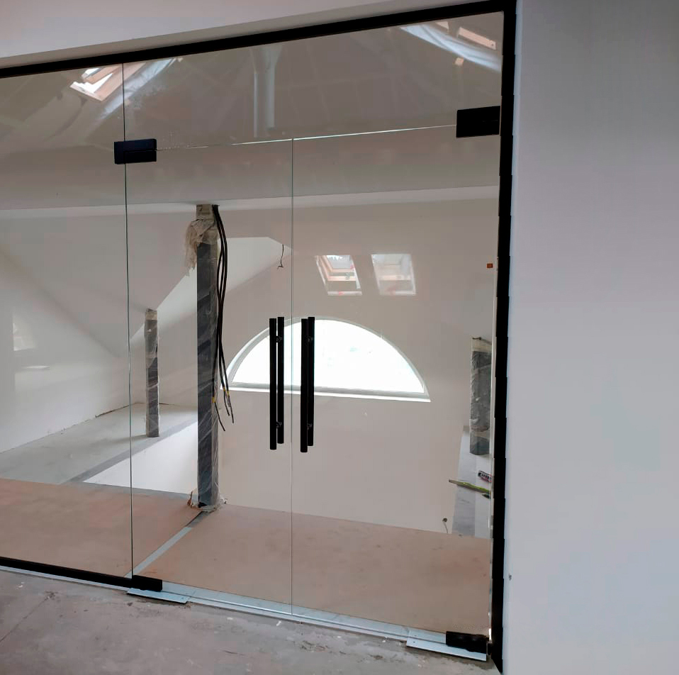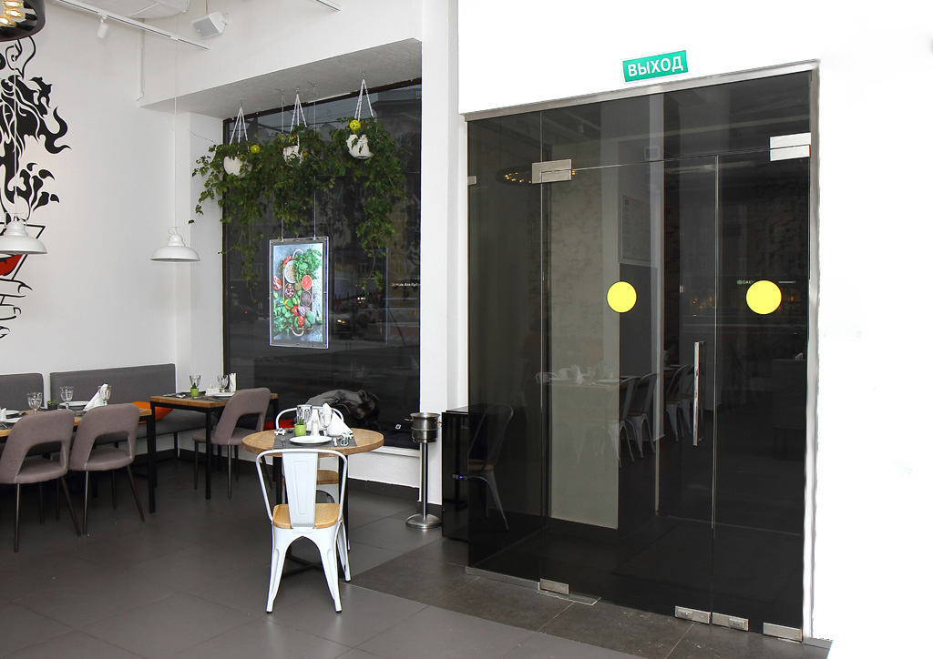 Перегородка и 2 двери из триплекса со средней фрамугой хит продаж для бутика, кафе и ресторана, бизнес-центра, салона красоты производится из стекла, цельного стекла, закаленного стекла, триплекса, подходит для декоративного оформления, для звукоизоляции, для регулирования приватности, для престижных интерьеров, для визуального простора. Конструкция - дверь. Доступны варианты оформления - прозрачные, осветленные OptiWhite, с химическим травлением.