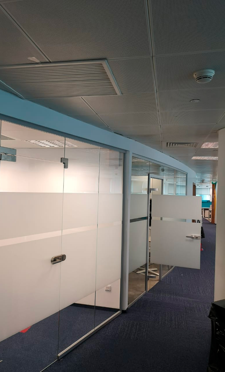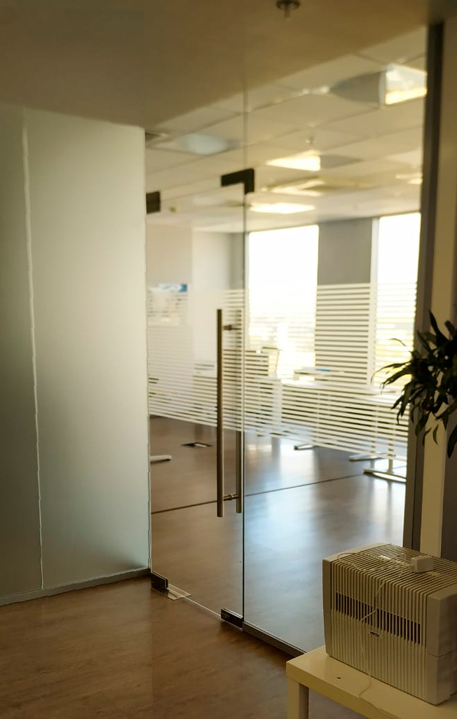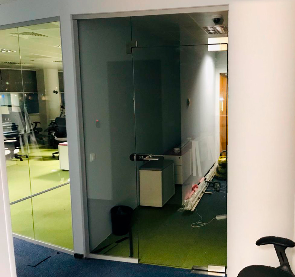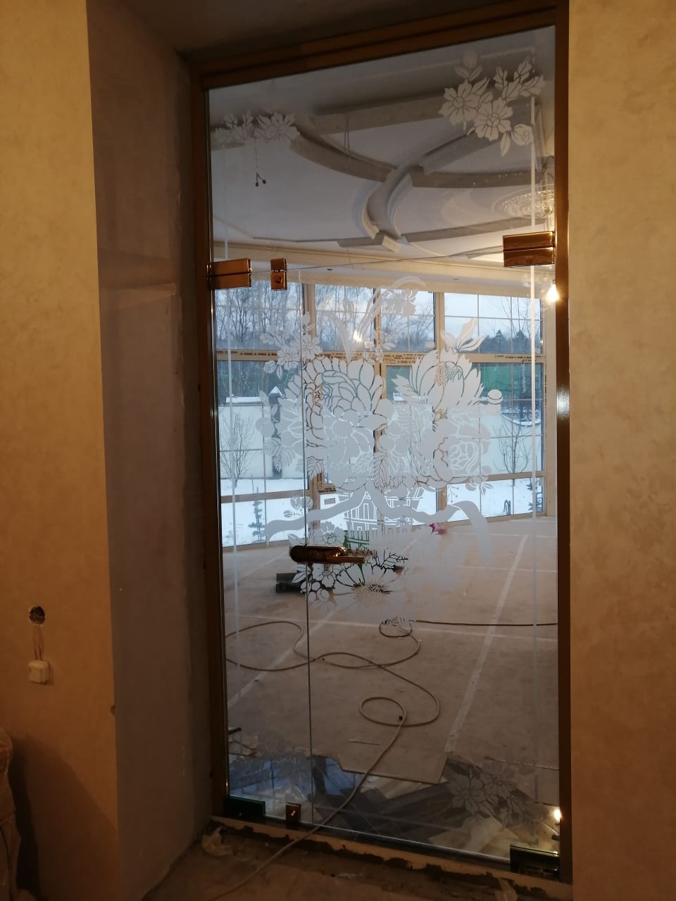 Стеклянная дверь и одна перегородка с фрамугой от 10-12мм трендовая для дома, квартиры, бизнес-центра производится из стекла, закаленного стекла, используется для зонирования, для регулирования приватности, для организации пространства. Тип конструкции - дверь. Варианты оформления - матовые, с пескоструйной обработкой.