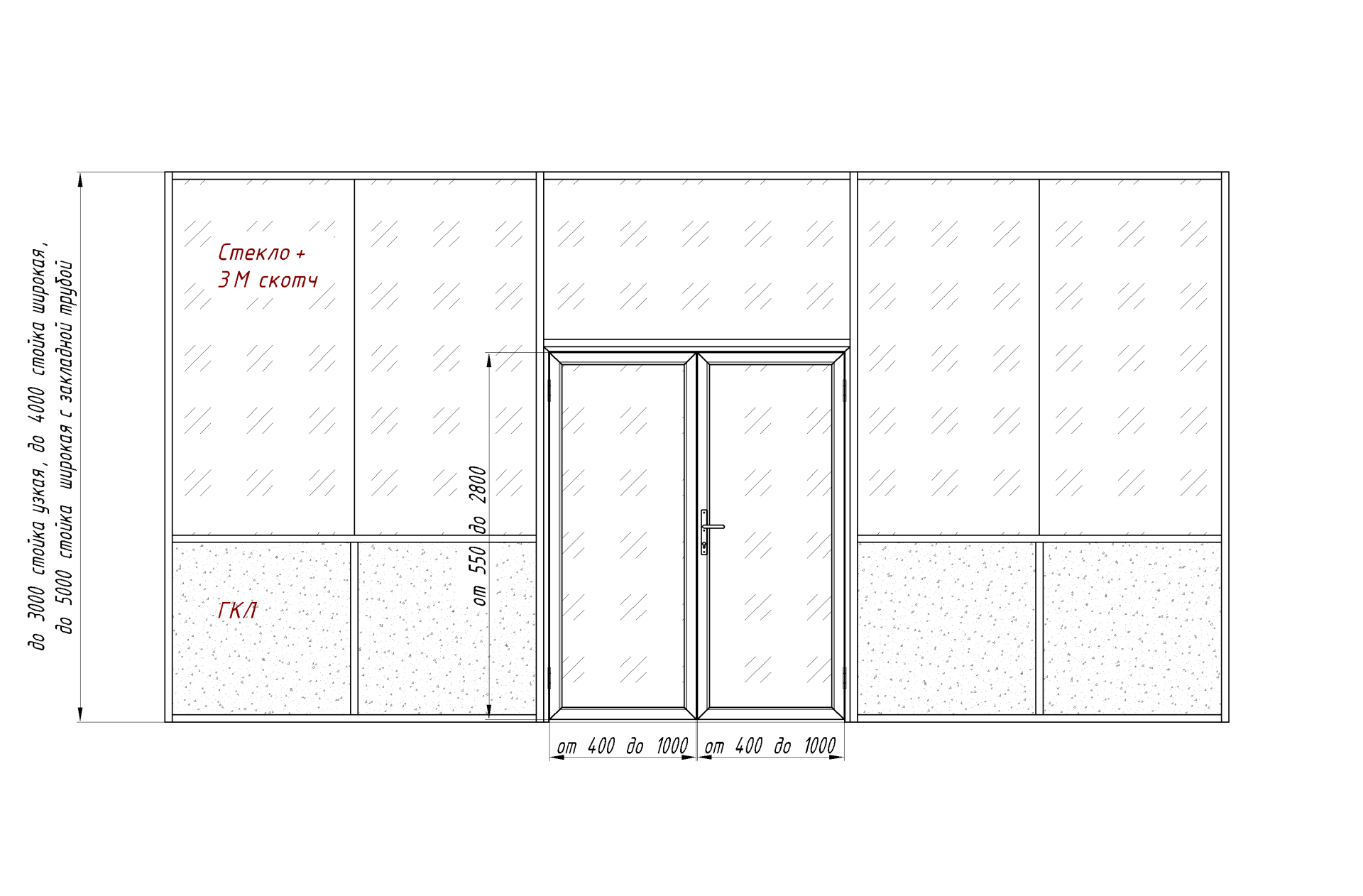 Каркасная перегородка с двустворчатой дверью, двойное остекление с проклейкой стыков 3М скотчем, нижней рассечкой и заполнением ГКЛ бюджетная для торгового центра, бутика, гостиницы, аэропорта и вокзала изготавливается из стекла, алюминия, стали, подходит для организации рабочего места, для звукоизоляции, для регулирования приватности, для визуального простора. Конструкция - каркасная перегородка. Доступное оформление - матовые, осветленные OptiWhite, с пескоструйной обработкой.