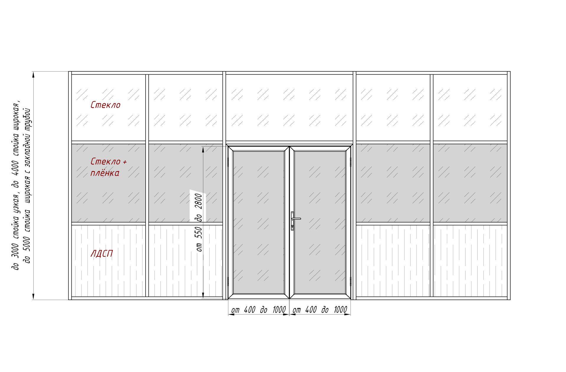 Каркасная перегородка с двустворчатой дверью, двойное остекление с тонировочной пленкой, верхней и нижней рассечкой и заполнением ЛДСП хит продаж для кафе и ресторана, гостиницы, бизнес-центра, аэропорта и вокзала изготавливается из стекла, ЛДСП, используется для организации рабочего места, для декоративного оформления, для экономии места, для регулирования приватности.Тип товара - каркасная перегородка. Варианты оформления - прозрачные, с химическим травлением.