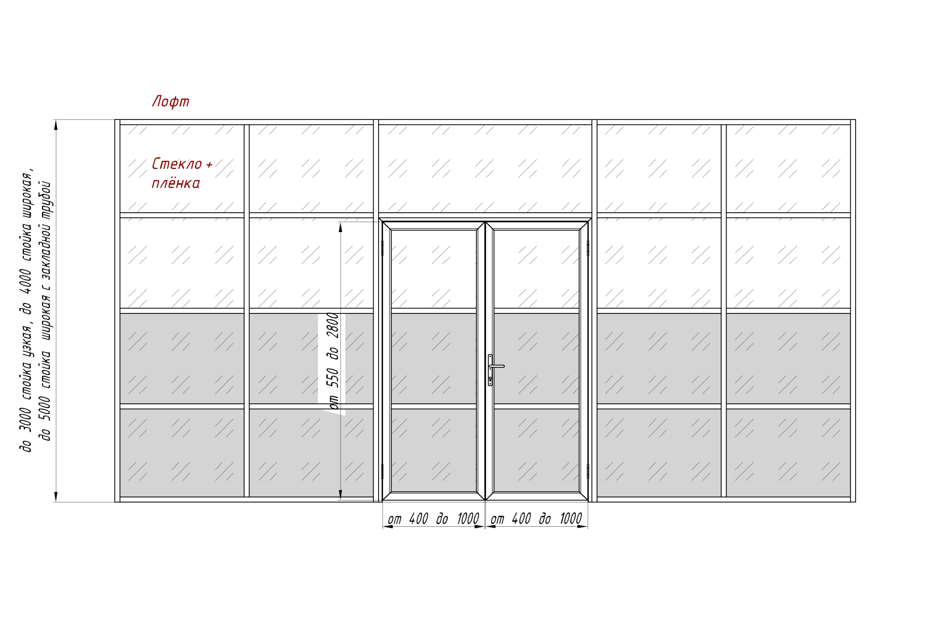 Каркасная перегородка с двустворчатой дверью, одинарное остекление с тонировочной пленкой и многократной рассечкой бюджетная для гостиницы, медицинского учреждения, бизнес-центра, аэропорта и вокзала производится из стекла, алюминия, стали, используется для организации рабочего места, для звукоизоляции, для организации пространства, для визуального простора. Тип товара - каркасная перегородка. Доступны варианты оформления - матовые, с химическим травлением.