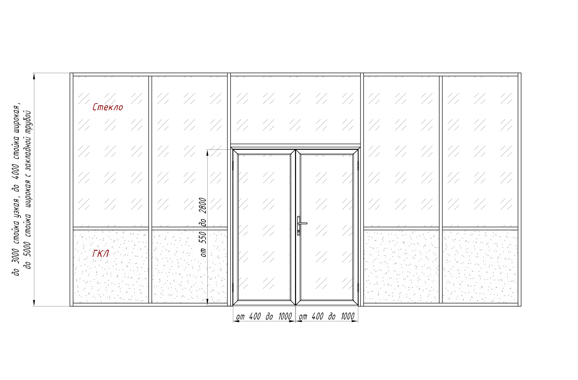 Каркасная перегородка с двустворчатой дверью, одинарное остекление с нижней рассечкой и заполнением ГКЛ стандартная для торгового центра, бутика, магазина, кафе и ресторана производится из стекла, стали, подходит для организации рабочего места, для звукоизоляции, для регулирования приватности, для престижных интерьеров.Тип товара - каркасная перегородка. Варианты оформления - прозрачные, с пескоструйной обработкой.