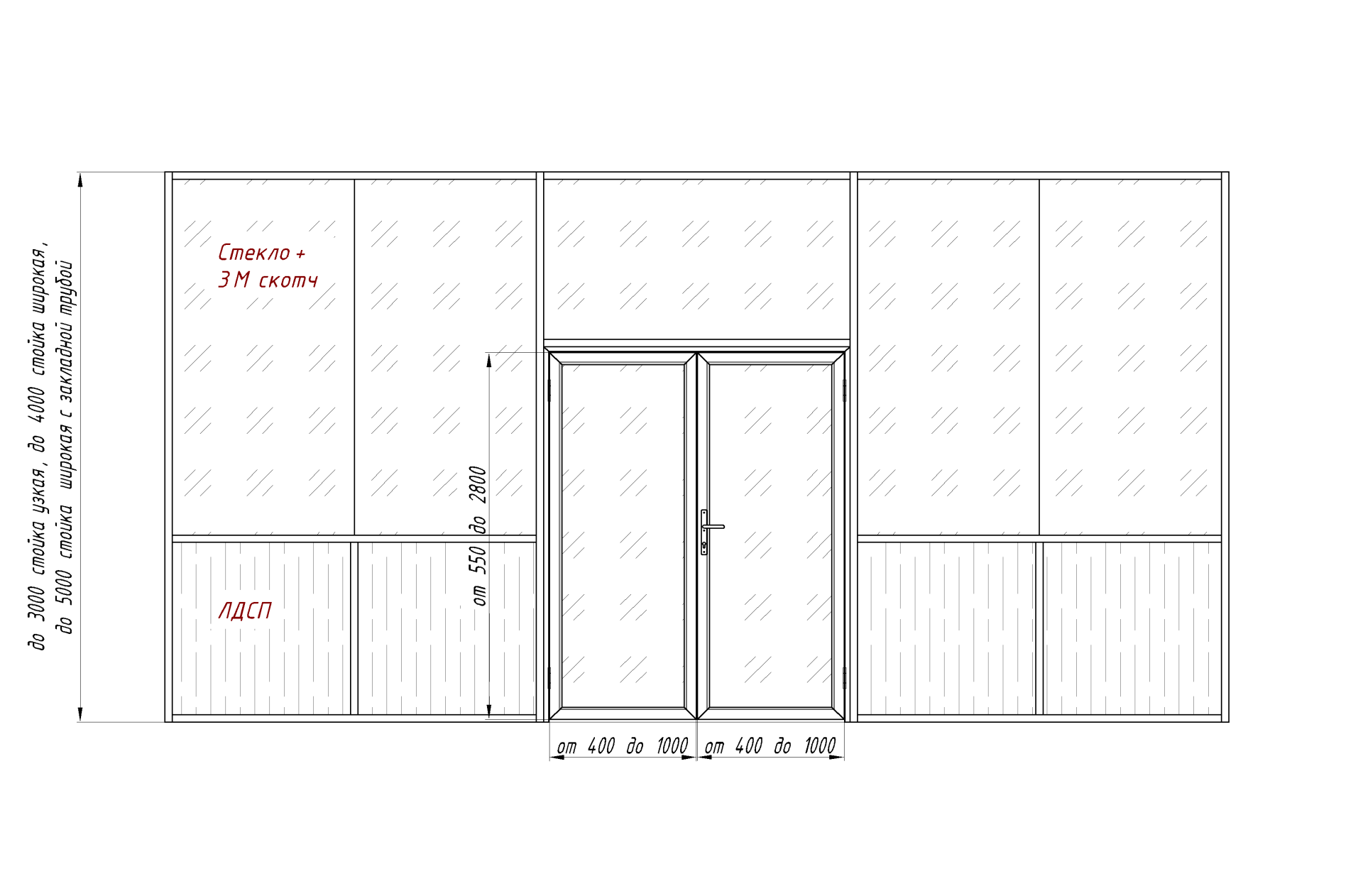 Каркасная перегородка с двустворчатой дверью, одинарное остекление с проклейкой стыков 3М скотчем, нижней рассечкой и заполнением ЛДСП бизнес-класса для торгового центра, бутика, магазина, кафе и ресторана изготавливается из стекла, ЛДСП, используется для зонирования, для организации рабочего места, для регулирования приватности, для визуального простора. Тип товара - каркасная перегородка. Тип оформления - матовые, грей, с пескоструйной обработкой.